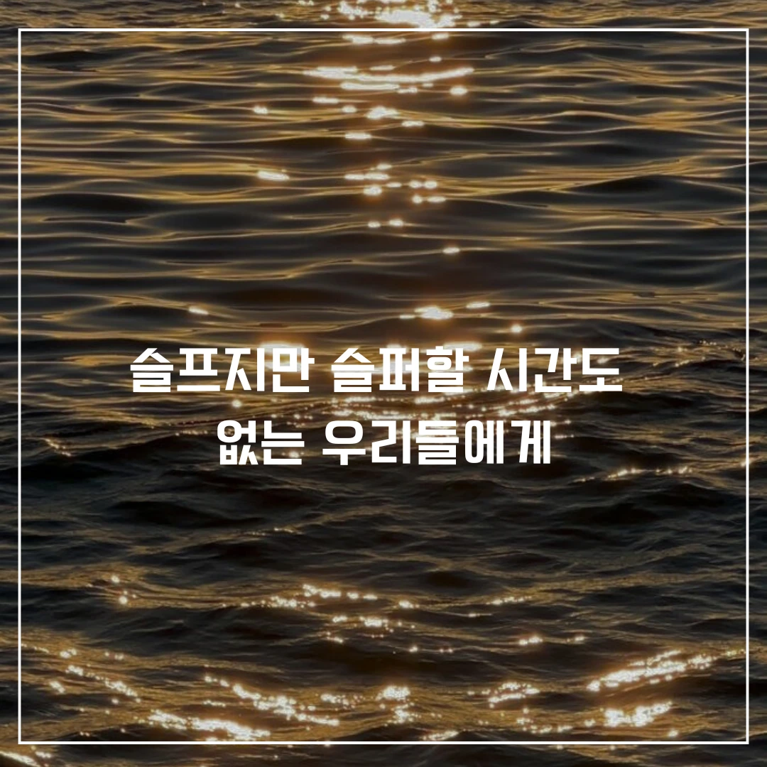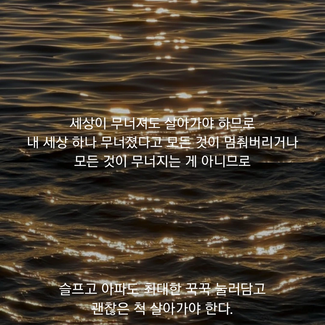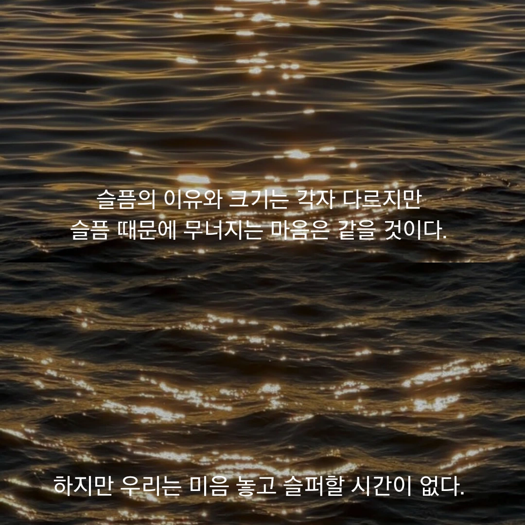 슬픔의 이유와 크기는 각자 다르지만 슬픔 때문에 무너지는 마음은 같을 것이다. 하지만 우리는 미음 놓고 슬퍼할 시간이 없다. 세상이 무너져도 살아가야 하므로 내 세상 하나 무너졌다고 모든 것이 멈춰버리거나 모든 것이 무너지는 게 아니므로 슬프고 아파도 최대한 꾹꾹 눌러담고 괜찮은 척 살아가야 한다.