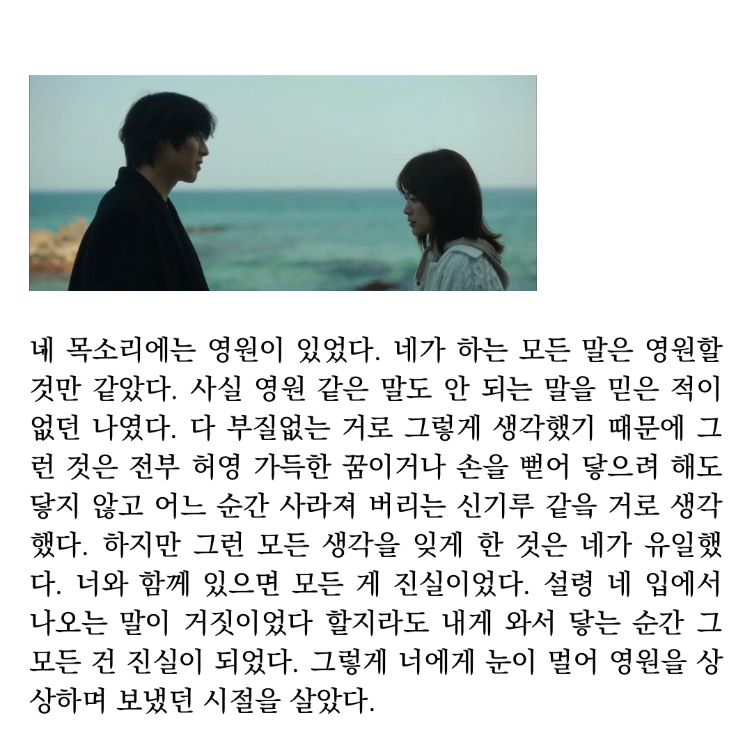 네 목소리에는 영원이 있었다. 네가 하는 모든 말은 영원할 것만 같았다. 사실 영원 같은 말도 안 되는 말을 믿은 적이 없던 나였다. 다 부질없는 거로 그렇게 생각했기 때문에 그런 것은 전부 허영 가득한 꿈이거나 손을 뻗어 닿으려 해도 닿지 않고 어느 순간 사라져 버리는 신기루 같읔 거로 생각했다.