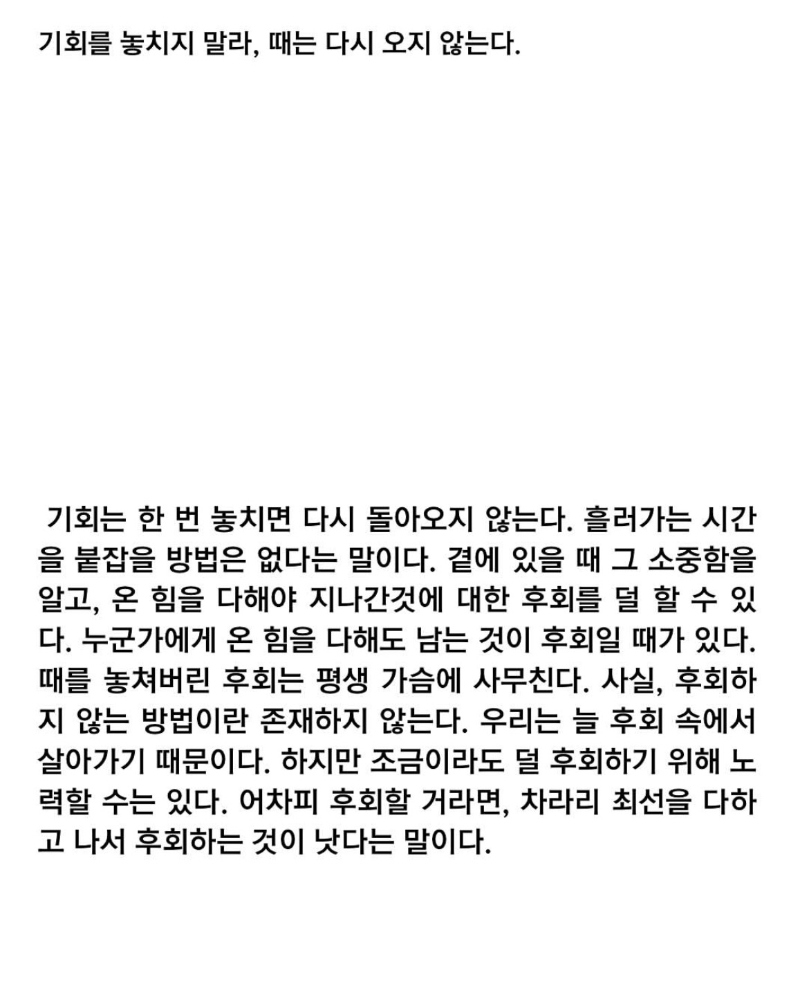 기회는 한 번 놓치면 다시 돌아오지 않는다. 흘러가는 시간을 붙잡을 방법은 없다는 말이다. 곁에 있을 때 그 소중함을 알고, 온 힘을 다해야 지나간 것에 대한 후회를 덜 할 수 있다. 누군가에게 온 힘을 다해도 남는 것이 후회일 때가 있다. 때를 놓쳐버린 후회는 평생 가슴에 사무친다. 사실, 후회하지 않는 방법이란 존재하지 않는다. 우리는 늘 후회 속에서 살아가기 때문이다. 하지만 조금이라도 덜 후회하기 위해 노력할 수는 있다. 어차피 후회할 거라면, 차라리 최선을 다하고 나서 후회하는 것이 낫다는 말이다.