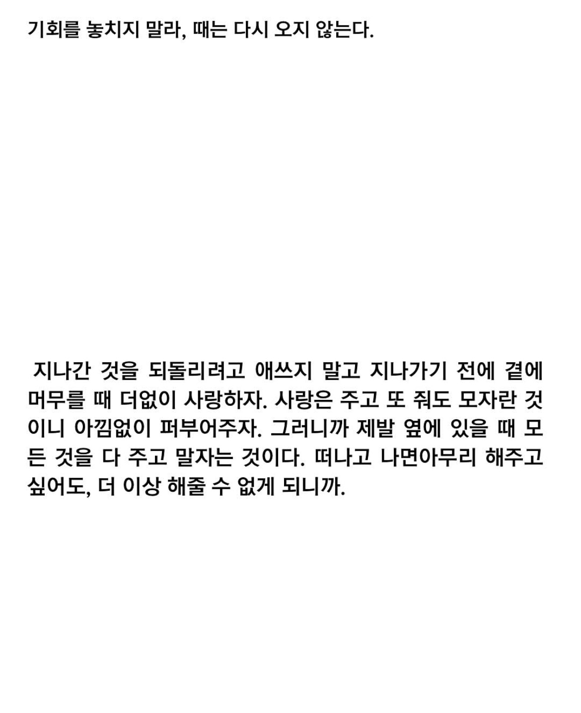 지나간 것을 되돌리려고 애쓰지 말고 지나가기 전에 곁에 머무를 때 더없이 사랑하자. 사랑은 주고 또 줘도 모자란 것이니 아낌없이 퍼부어주자. 그러니까 제발 옆에 있을 때 모든 것을 다 주고 말자는 것이다. 떠나고 나면 아무리 해주고 싶어도, 더 이상 해줄 수 없게 되니까.