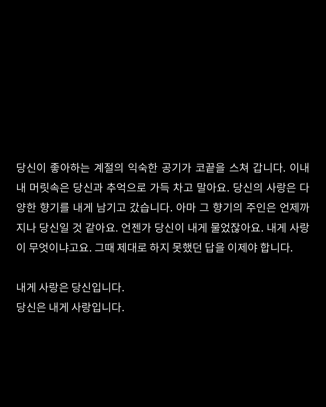 당신이 좋아하는 계절의 익숙한 공기가 코끝을 스쳐 갑니다. 이내 내 머릿속은 당신과 추억으로 가득 차고 말아요. 당신의 사랑은 다양한 향기를 내게 남기고 갔습니다. 아마 그 향기의 주인은 언제까지나 당신일 것 같아요. 언젠가 당신이 내게 물었잖아요. 내게 사랑이 무엇이냐고요. 그때 제대로 하지 못했던 답을 이제야 합니다.