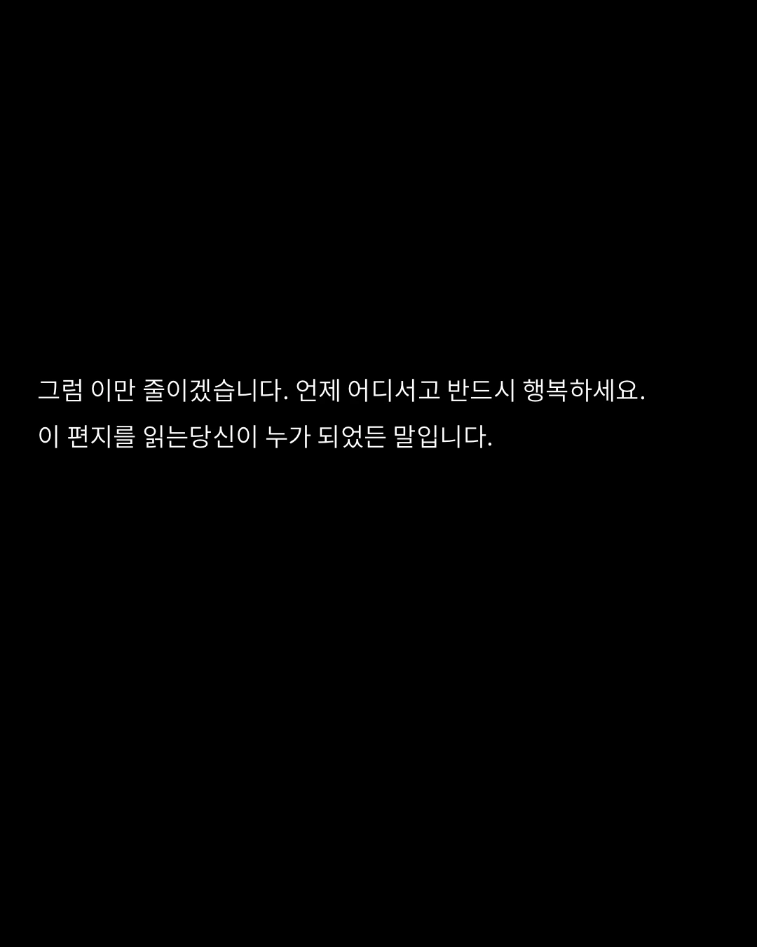 그럼 이만 줄이겠습니다. 언제 어디서고 반드시 행복하세요. 이 편지를 읽는 당신이 누가 되었든 말입니다.