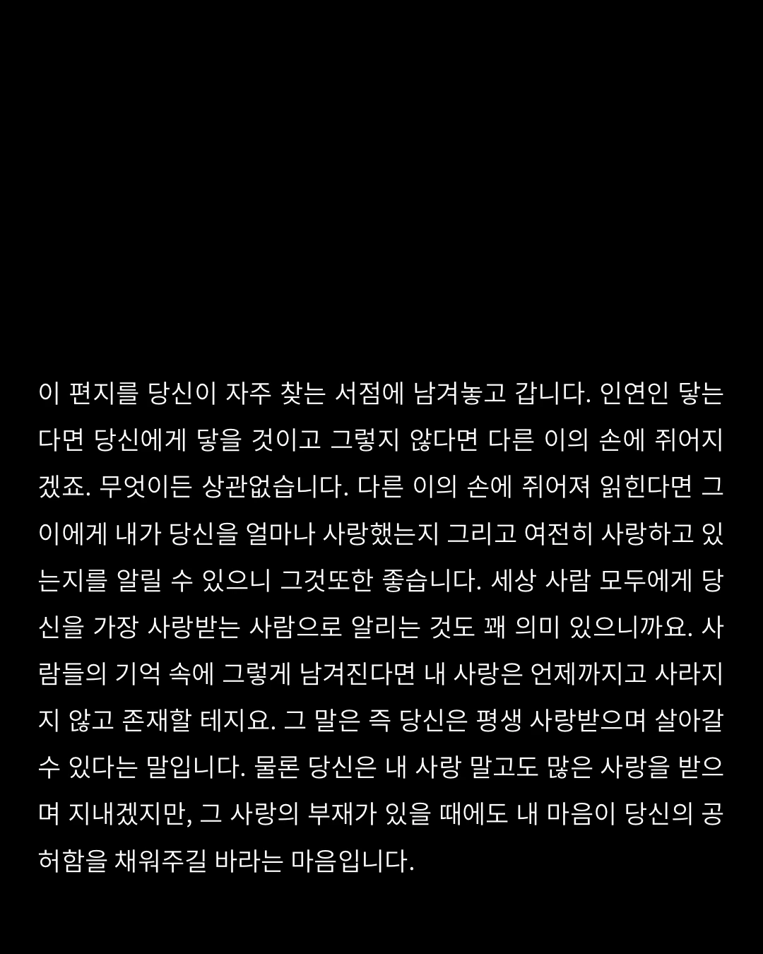 이 편지를 당신이 자주 찾는 서점에 남겨놓고 갑니다. 인연인 닿는다면 당신에게 닿을 것이고 그렇지 않다면 다른 이의 손에 쥐어지겠죠. 무엇이든 상관없습니다. 다른 이의 손에 쥐어져 읽힌다면 그이에게 내가 당신을 얼마나 사랑했는지 그리고 여전히 사랑하고 있는지를 알릴 수 있으니 그것또한 좋습니다. 세상 사람 모두에게 당신을 가장 사랑받는 사람으로 알리는 것도 꽤 의미 있으니까요. 사람들의 기억 속에 그렇게 남겨진다면 내 사랑은 언제까지고 사라지지 않고 존재할 테지요. 그 말은 즉 당신은 평생 사랑받으며 살아갈 수 있다는 말입니다. 물론 당신은 내 사랑 말고도 많은 사랑을 받으며 지내겠지만, 그 사랑의 부재가 있을 때에도 내 마음이 당신의 공허함을 채워주길 바라는 마음입니다.