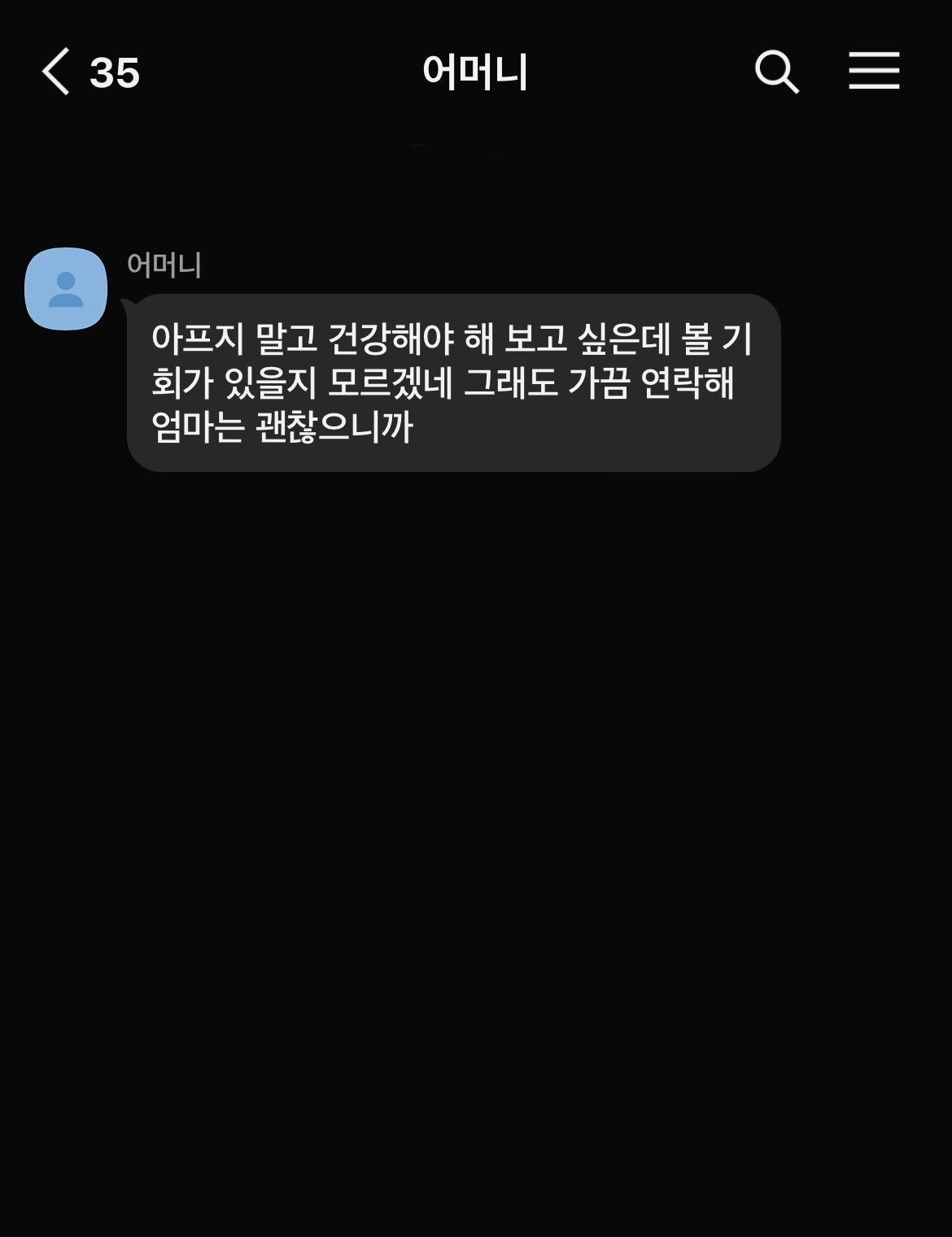 나 너희 어머니기 너무 보고 싶다? 너희 집에 가면 항상 웃는 얼굴로 반겨주시면서 맛있는 밥 차려주셨잖아. 나 엄청나게 예뻐해 주시고 늘 건강도 챙겨주시고 또 우리 엄마랑 너무 비슷해서 더 마음이 찡한 것도 있었고 말이야. 매년 어버이날도 내가 항상 챙겨 드렸는데 어느날 내 생일에 어머니가 용돈 하라고 주셨던 돈이랑 생일 축하한다면서 안 아주 섰던 게 아직도 기억이 나. 너랑 너희 어머니 그리고 나 이렇게 셋이 여행도 꼭 가보고 싶었어. 아니 굳이 내가 없어도 두 모녀 여행 보내주는 게 내 꿈이었는데