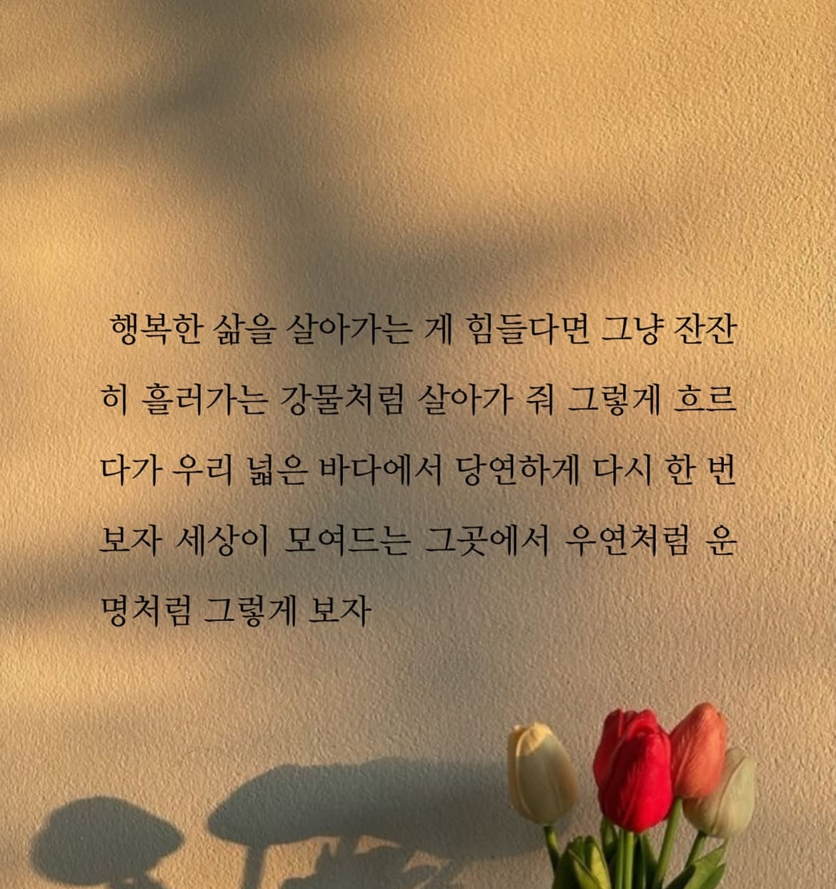 행복한 삶이 어렵다면 억지로 버티려 하지 말고 강물처럼 조용히 흘러가 줘. 흐르는 동안 바람도 만나고 햇살도 머금으며 그렇게 천천히 흘러가다 보면 어느 날 우리 넓은 바다에서 다시 마주할지도 모르니까 말이야.