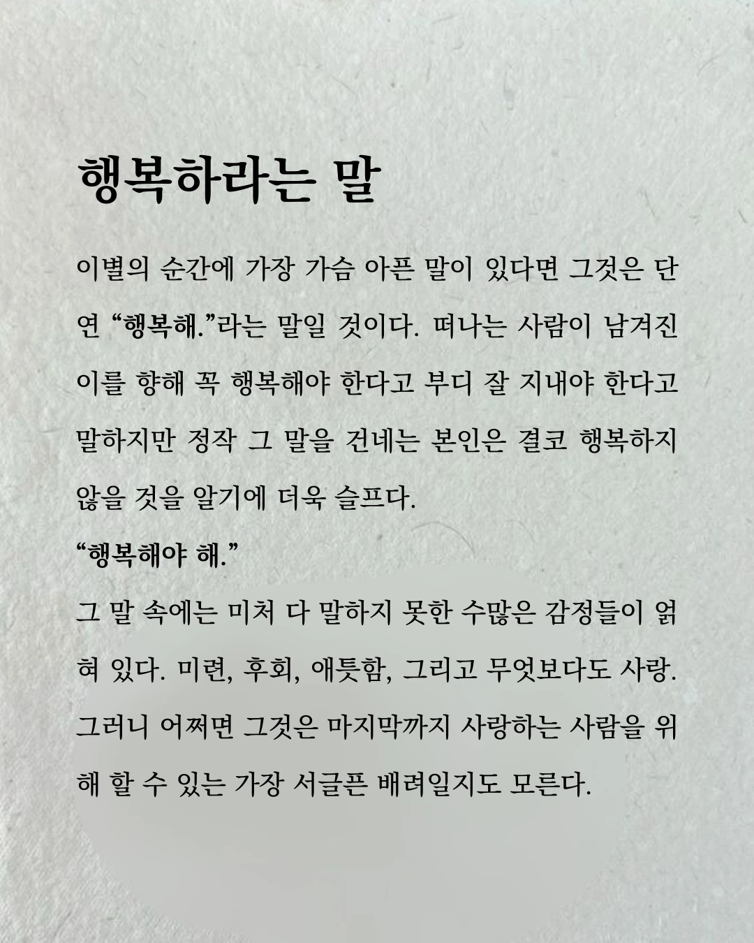 그러나 우리는 안다. 그 말을 건넨 사람도 그 말을 들은 사람도 한동안 행복할 수 없다는 것을. 그래서 “행복해”라는 말만큼 이별을 더 아프게 하는 말은 없다는 것도 우리는 너무 잘 알고 있다.