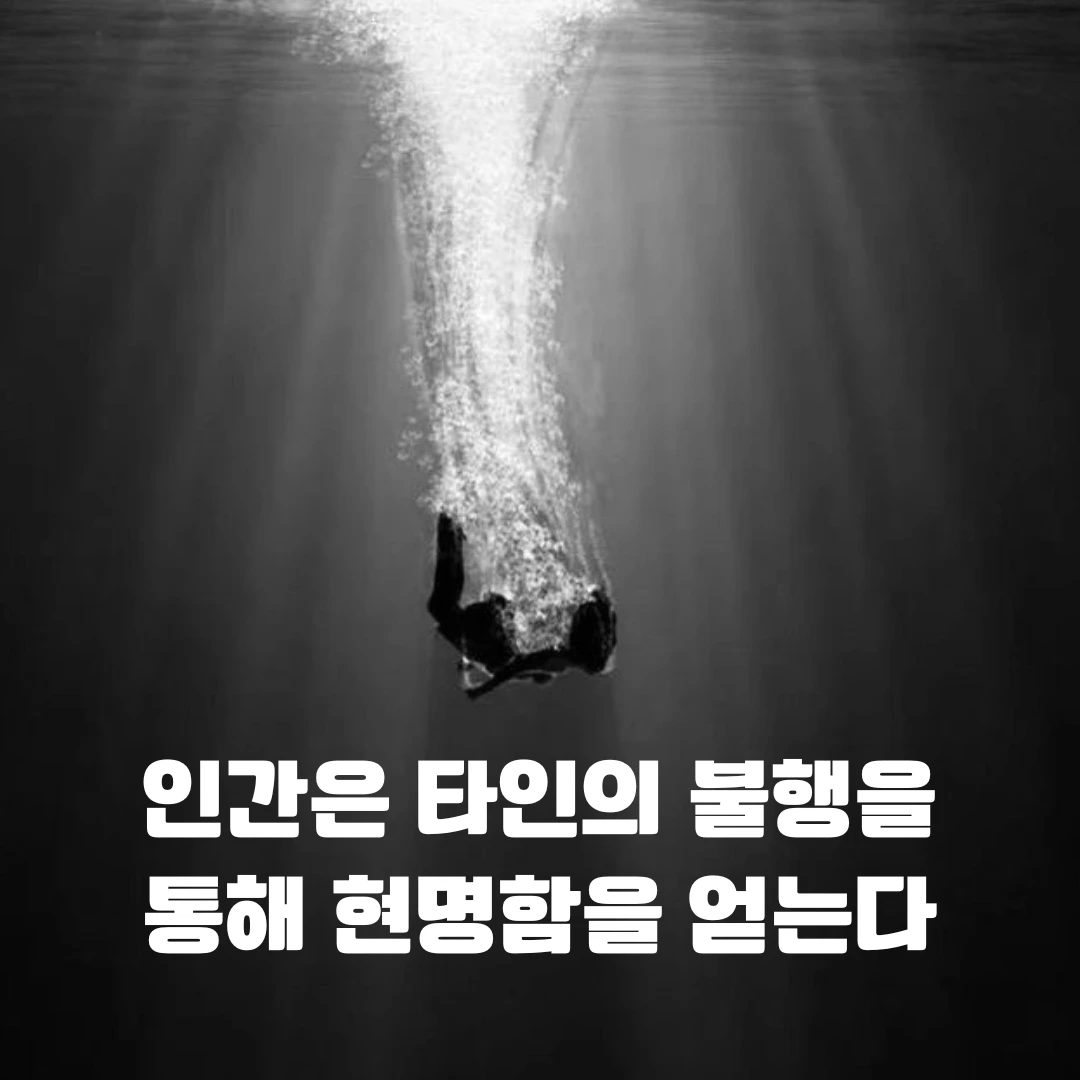 내가 겪지 않은 일임에도 다른 사람을 보며 깨달음을 얻는 경우가 있다. 그것은 기쁜 일보다는 불행한 일에서 더 많이 있는 경우다. 쉬운 예로 길을 걸어가다가 보도블록이 튀어나온 것을 보지 못하고 걸려 넘어지는 앞사람을 보고 아 저기 조심해서 지나가야겠다고 생각하며 피해 가는 것, 이것이 내가 말하는 타인의 불행에서 현명함을 얻는 것이다. 선생님이나 어른들이 많이 하시는 말 중 보고 느끼는 것이 없냐? 라큰 말이 있다. 이 말은 두 가지의 뜻이 있는데 첫 번째는 저 사람을 본받으라는 의미 두 번째는 너는 절대 저렇게 하지 마라 라는 의미 이 중 두 번째 뜻이 말하는 것 그것이 바로 타인의 불행을 통해 얻는 현명함이다.