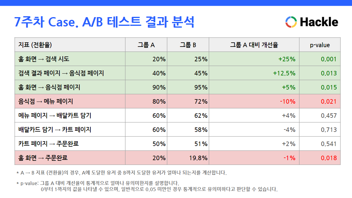 - 의사결정 시 고려해야 하는 것에 대해 간접 경험: 성공/실패 지표 기준에 부합하는가, 유의미한 결과의 기준은 무엇인가(p-value).