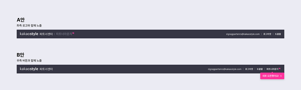 기존 GNB는 파트너센터 로고, 계정 정보, 도움말, 로그아웃 기능을 제공하고 있다. 파트너라운지는 파트너에게 유의미한 도움을 주거나 인사이트가 될 수 있는 데이터를 제공하는 역할을 갖고 있기 때문에 '도움말'과 함께 배치시킨다면 도움을 필요로 하는 사용자에게 자연스럽게 유입을 유도할 수 있을 것이라 판단했다.