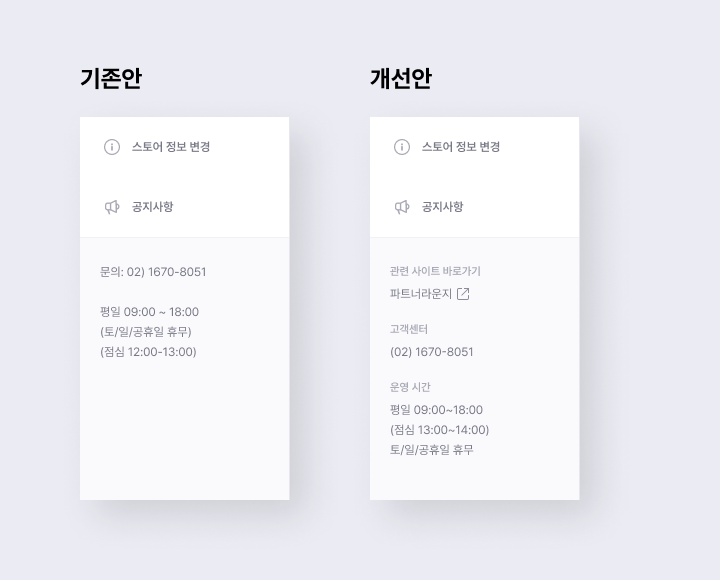 SNB 하단에는 고객센터 전화번호 및 운영 시간을 노출하고 있다. 이와 함께 파트너라운지를 노출시켜줌으로써 파트너가 고객센터에 전화로 문의하기 전에 겪고 있는 문제와 관련하여 도움을 줄 수 있는 곳임을 넛징할 수 있을 것이라 판단했다.