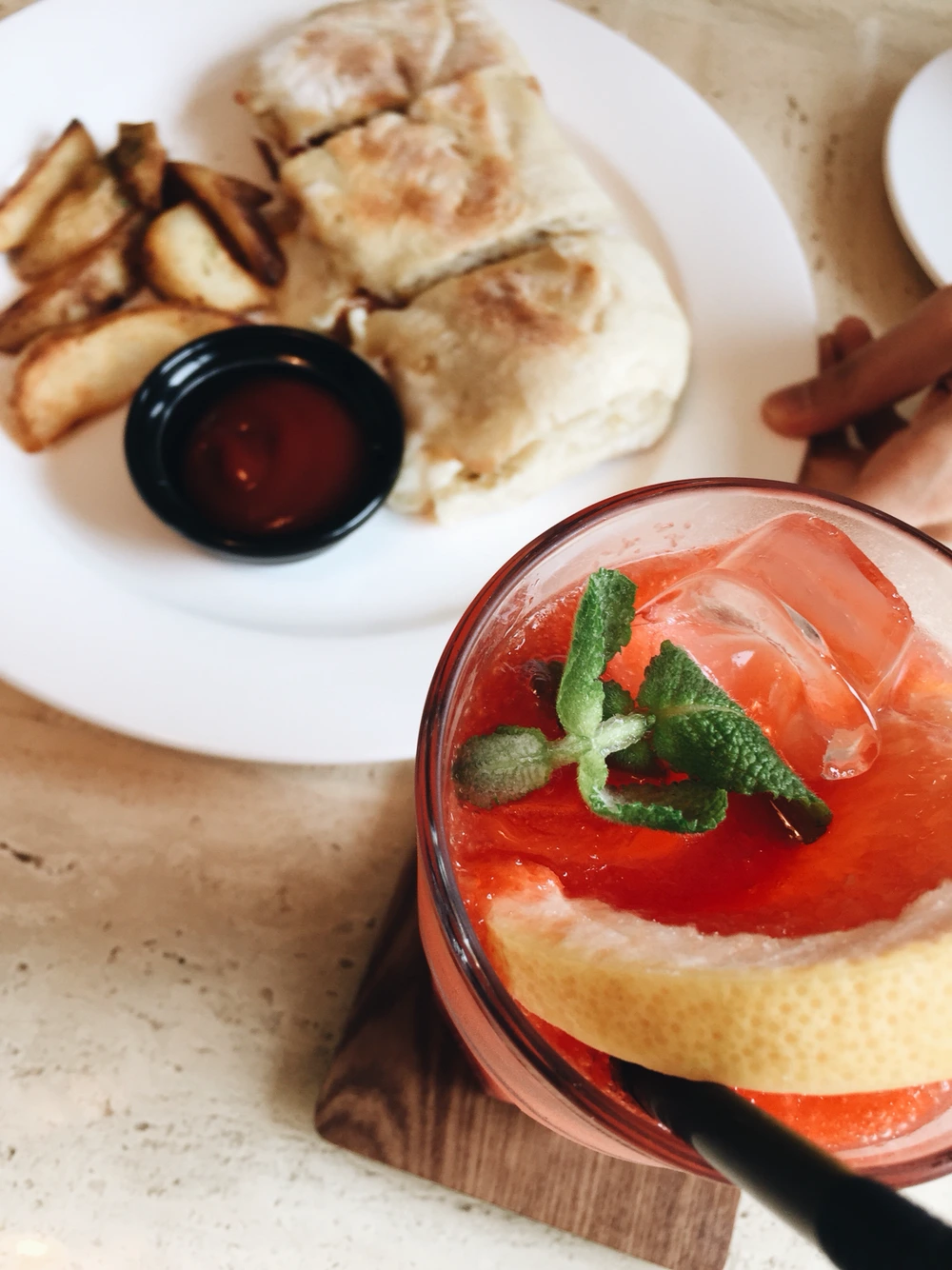메이와 예니가 주문한 파니니, 자몽에이드.