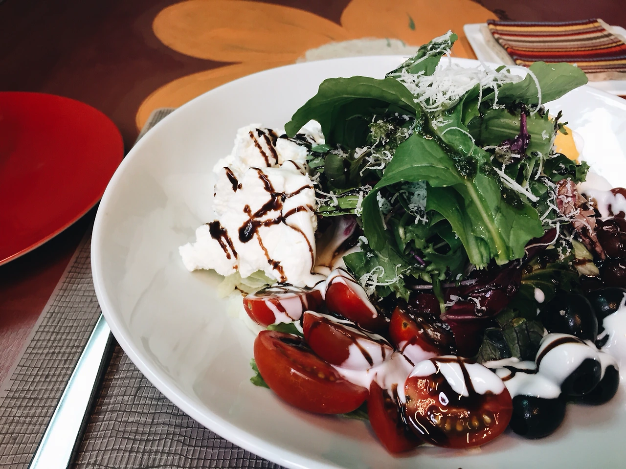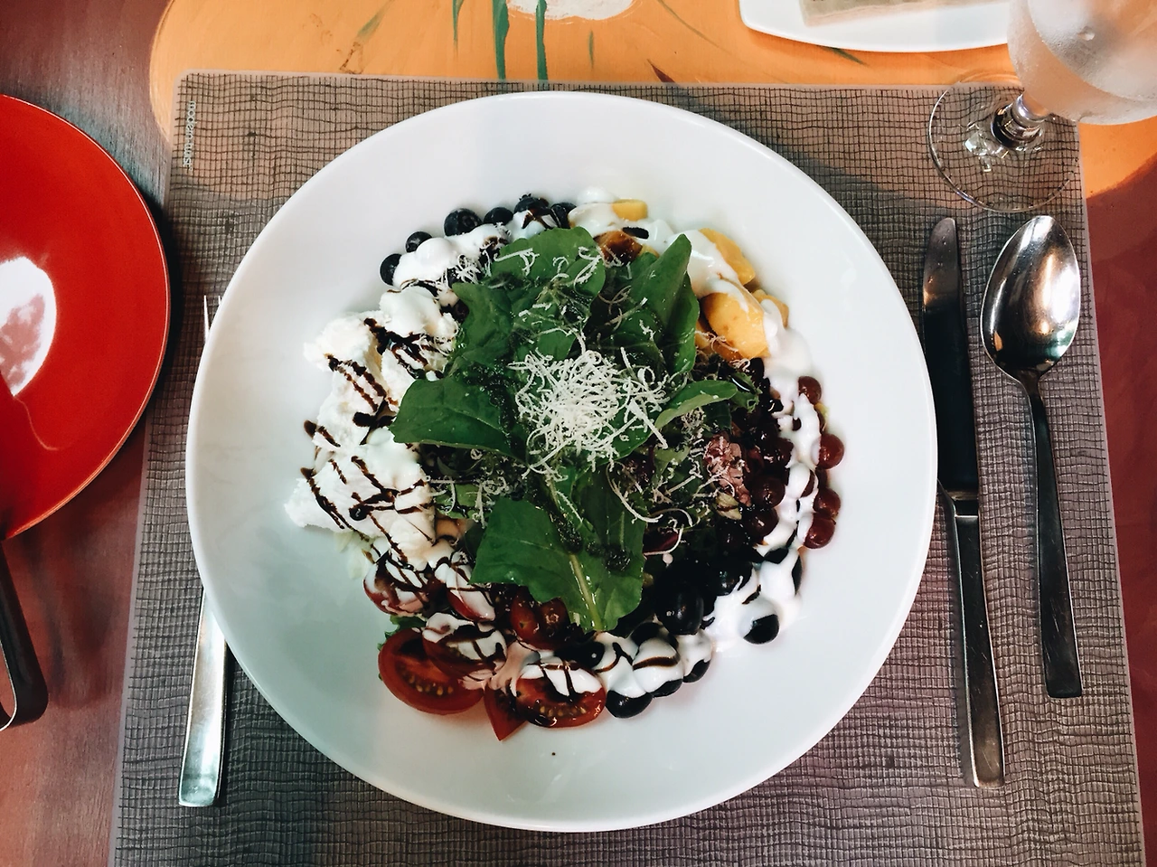 루꼴라에 치즈가루, 소담히 올려진 리코타치즈샐러드. 거기에 블랙올리브, 방울토마토, 미니 포도, 블루베리,망고까지 올려져 한눈에 봐도 풍성합니다.