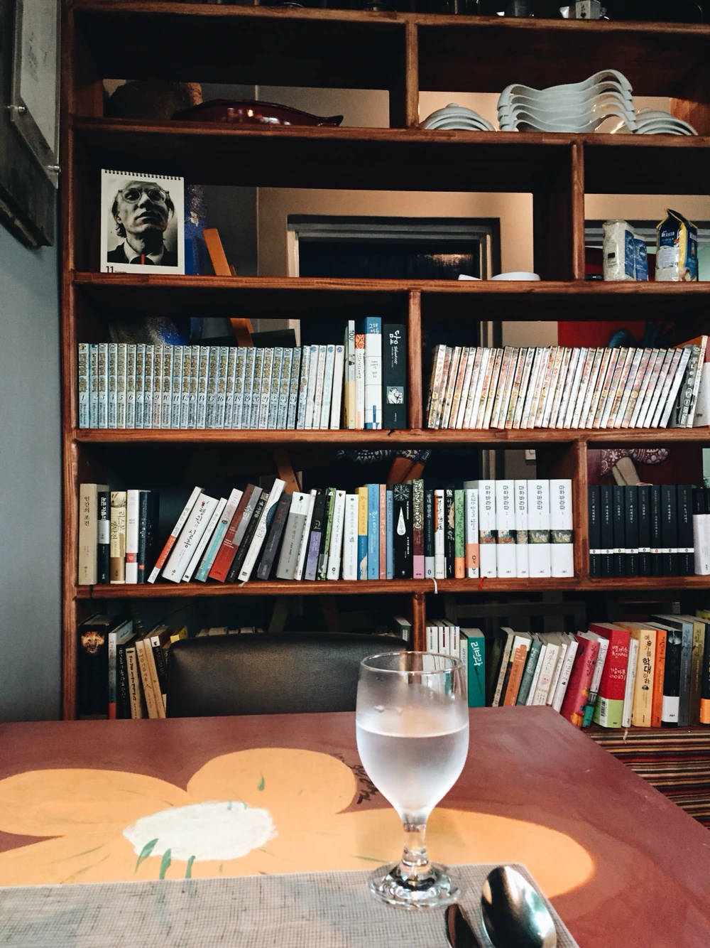 구석자리 한자리 차지하고 주문을 한뒤 책장엔 어떤 책들이 있나 둘러봅니다.