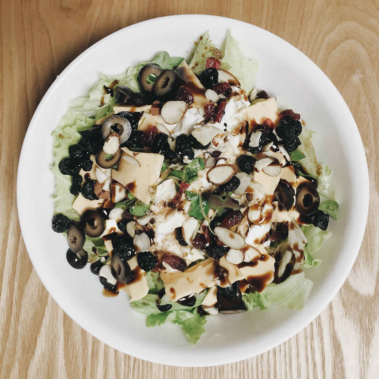 발사믹 식초와 올리브유로 만든 드레싱을 촵촵촵 뿌려주고, 발사믹 글레이즈를 촤라촥촥 지그재그로 뿌려준다. 너무 많이 뿌리면 샐러드고 뭐고 니맛도 내맛도 안나니 자제하며 뿌린다.