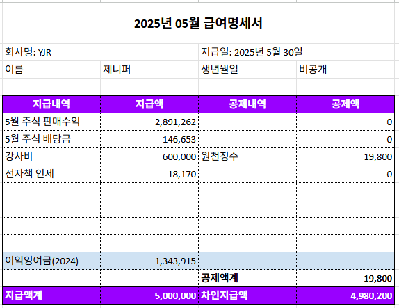 난생처음으로 월급 명세서를 만들고 한 달 동안 수고로운 노력으로 소득을 만든 나에게 편지도 써 보았다. 셀프 격려라도 뿌듯함이 덜하지 않았다. 5월을 결산해 보니 당월의 주식 판매수익금과 배당금의 합이 303만 원이고, 강사료 등 수입 62만 원을 더해도 365만 원이라서 책정한 급여 500만 원을 지급하기 위해서는 135만 원 정도 부족한 상황이 발생했다. 당월에 번 돈만으로 급여를 채워보겠다던 야심 찬 계획은 실패로 돌아갔다.