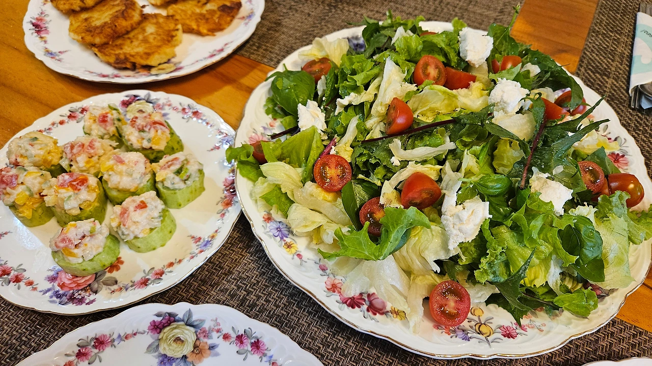 "양식과 한식이 절묘하게 섞여 보기에도 예쁘고 정성도 가득 들어가 한상 가득 대접받는 느낌 듬뿍! 애피타이저로 먼저 각종 샐러드와 계절과일, 차 등을 서브해 드려요."