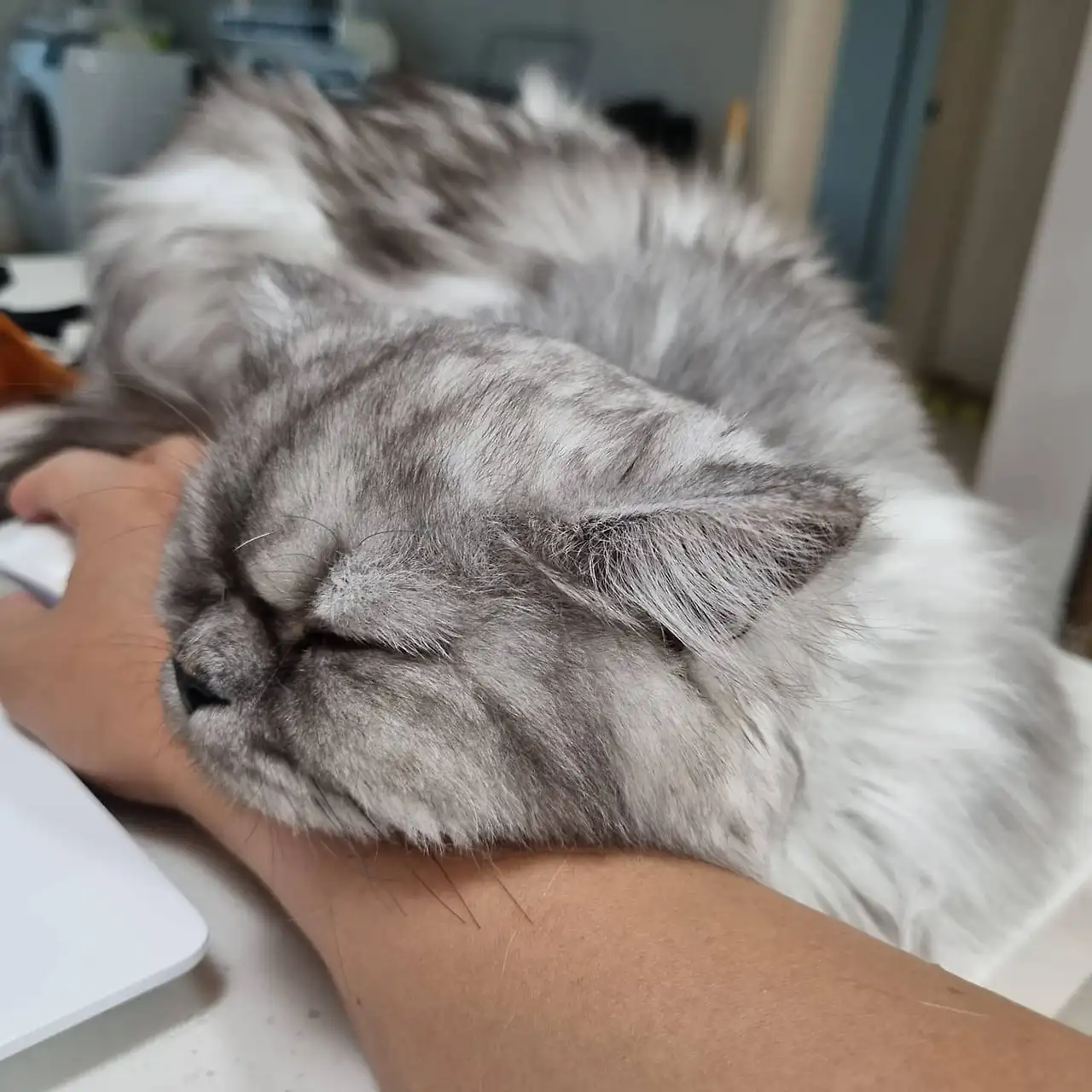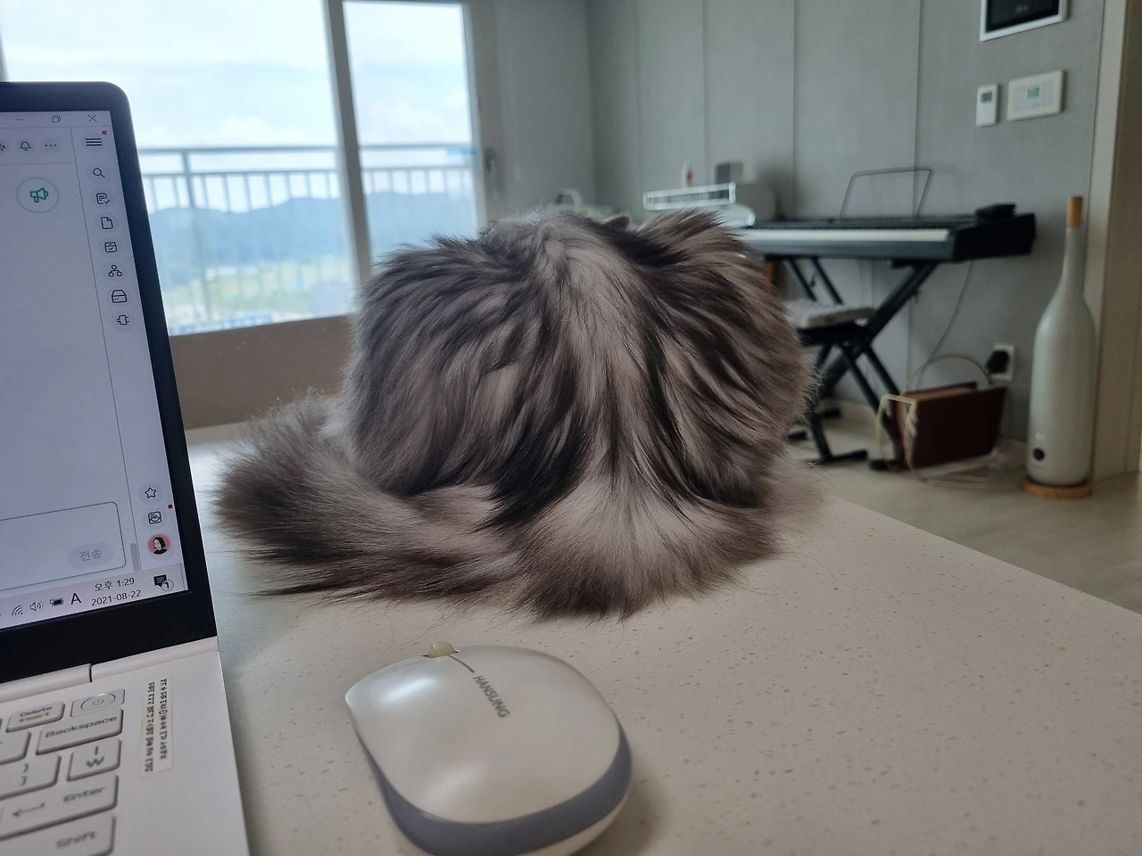 그럼 슬금슬금 다가와서 마우스를 쥔 내 팔 옆에 비집고 자리를 잡는다.