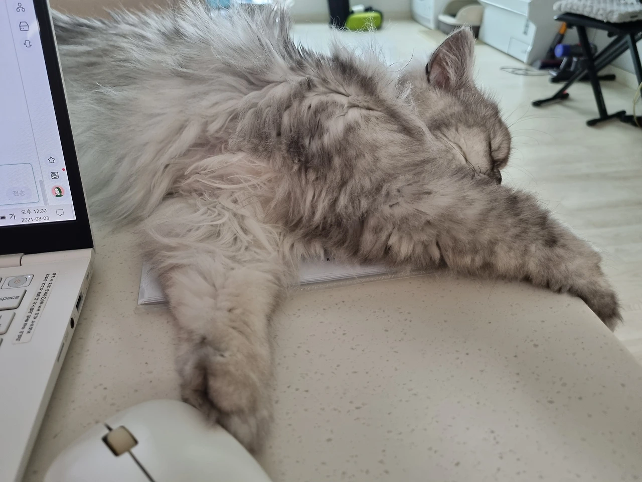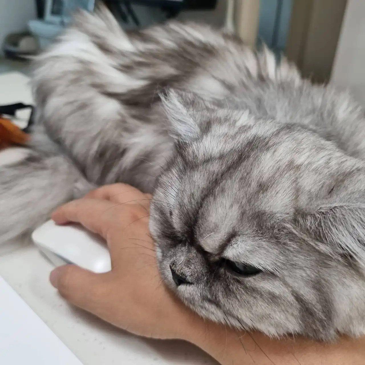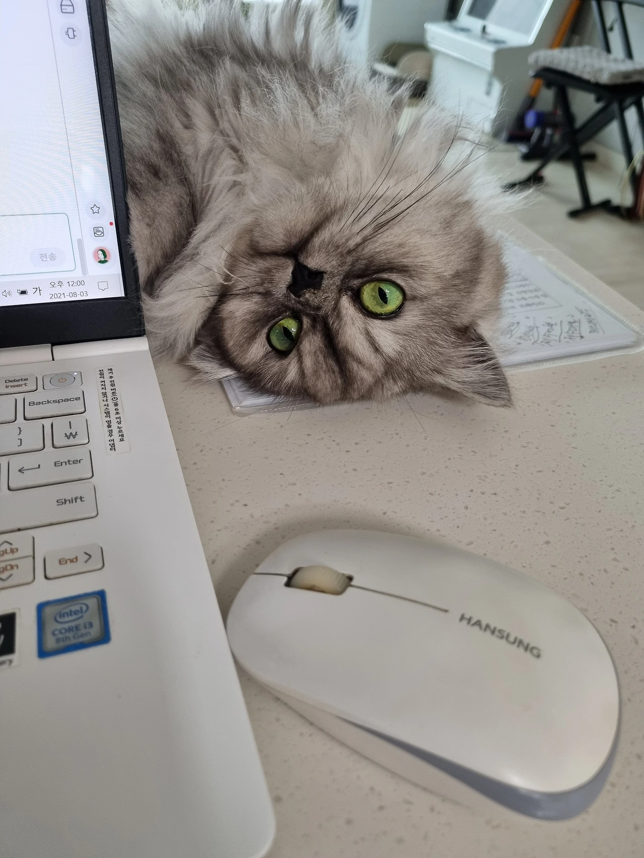 책상에 앉아 일을 하고 있으면 받을 게 있는 사람처럼 당당하게 마우스를 잡은 내 손밑으로 머리를 들이민다.