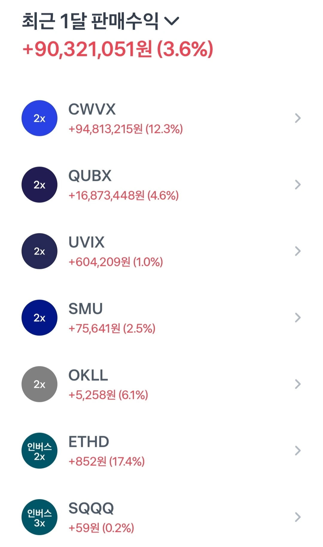분산된 섹터 투자 CWVX, QUBX, UVIX, SMU, OKLL, ETHD, SQQQ, NVD 등 다양한 종목 보유 → 특정 섹터 집중보다는 테마별 포트폴리오 분산.