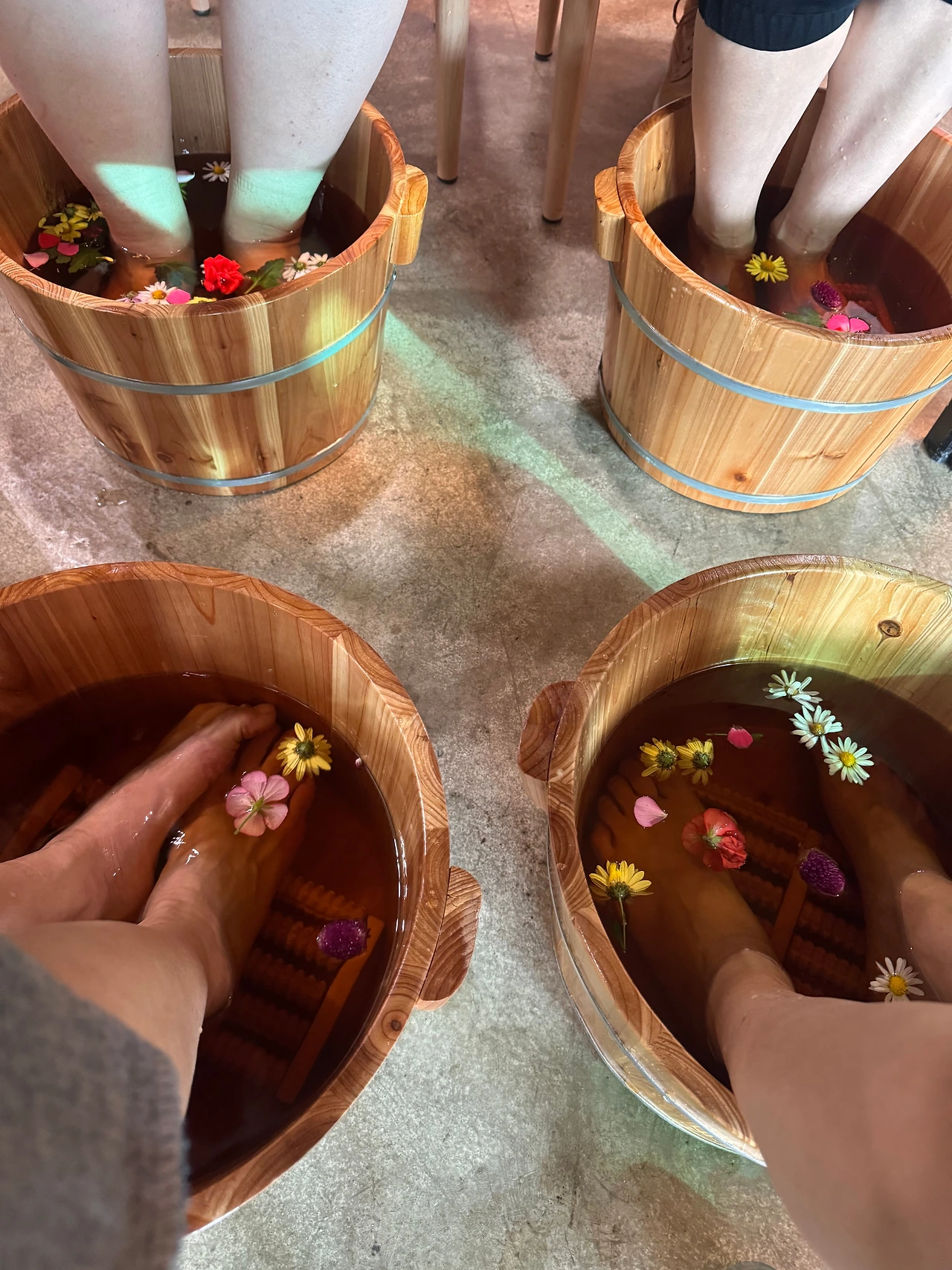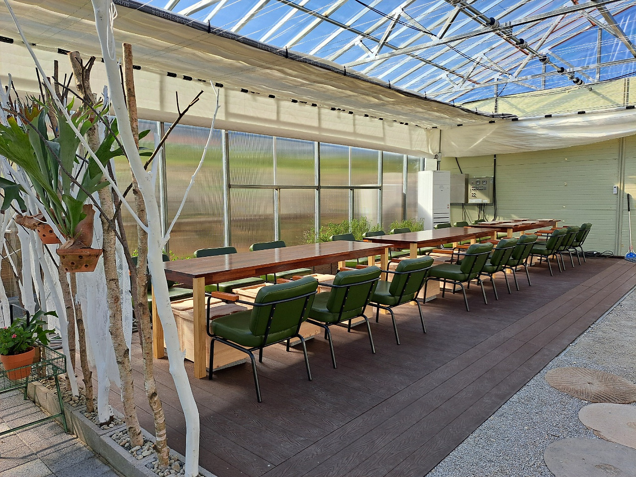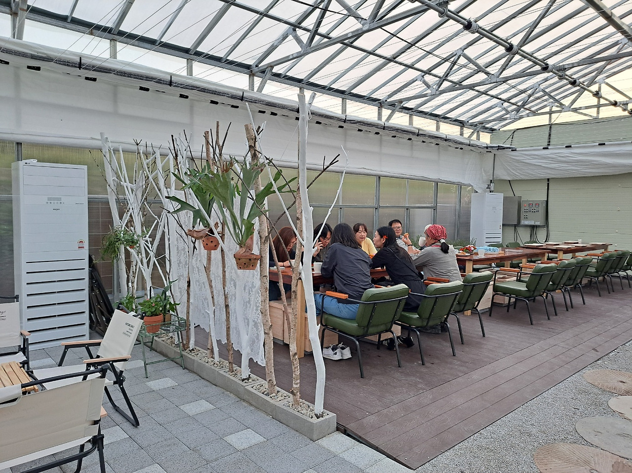 마당 앞에 60평짜리 온실이 생겼어요. 아직 다 완성은 안 됐어요. 공간이 조금씩 더 발전하고 있어요. 프로그램도 할 수 있고 족욕할 수 있고요. 지금 제가 가장 하고 싶은 게 아직 안 됐거든요. 저희가 그 공간에서 새싹 삼을 키워보려고 해요. 그걸 직접 수확해서 바로 할 수 있는 체험을 개발 중에 있습니다. 우리가 가끔 고급 식당 같은 데 가면 인삼처럼 생긴 작은 삼을 보셨을 텐데요. 그게 바로 새싹 삼입니다.
