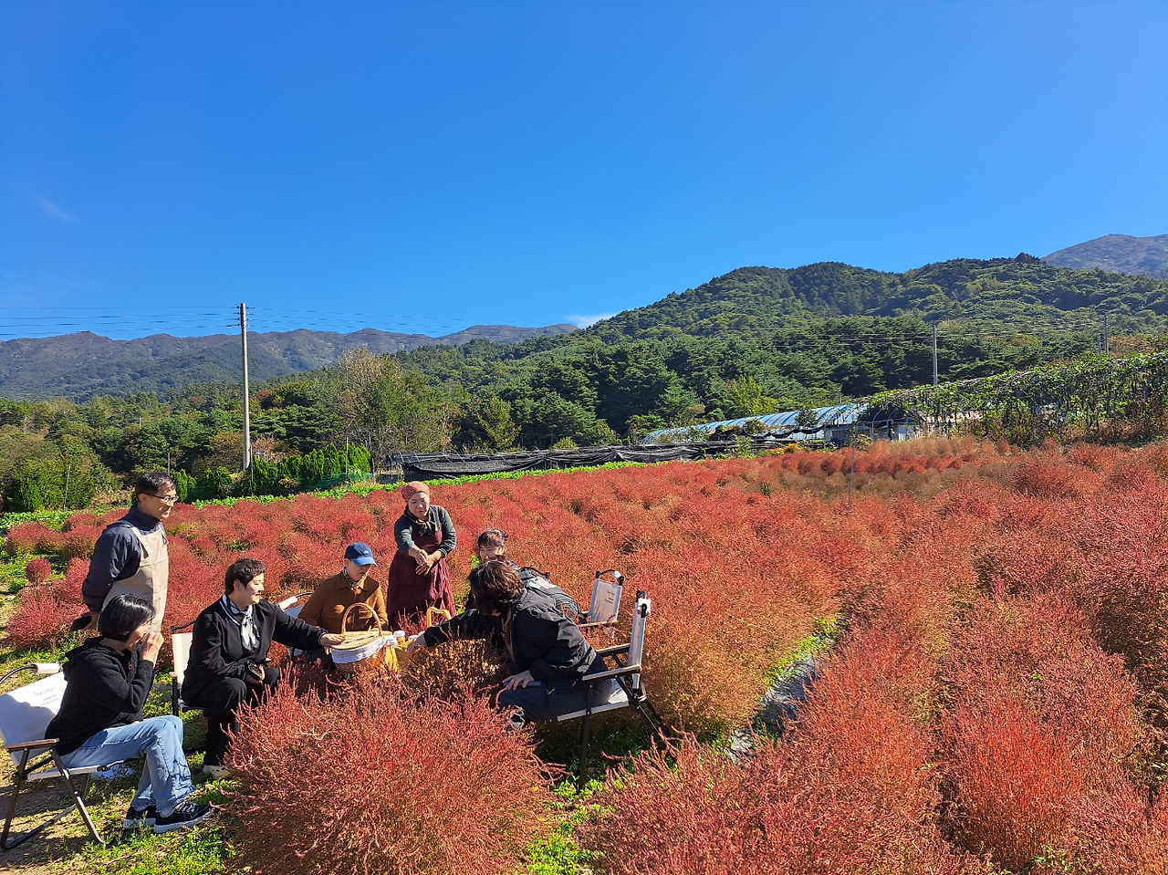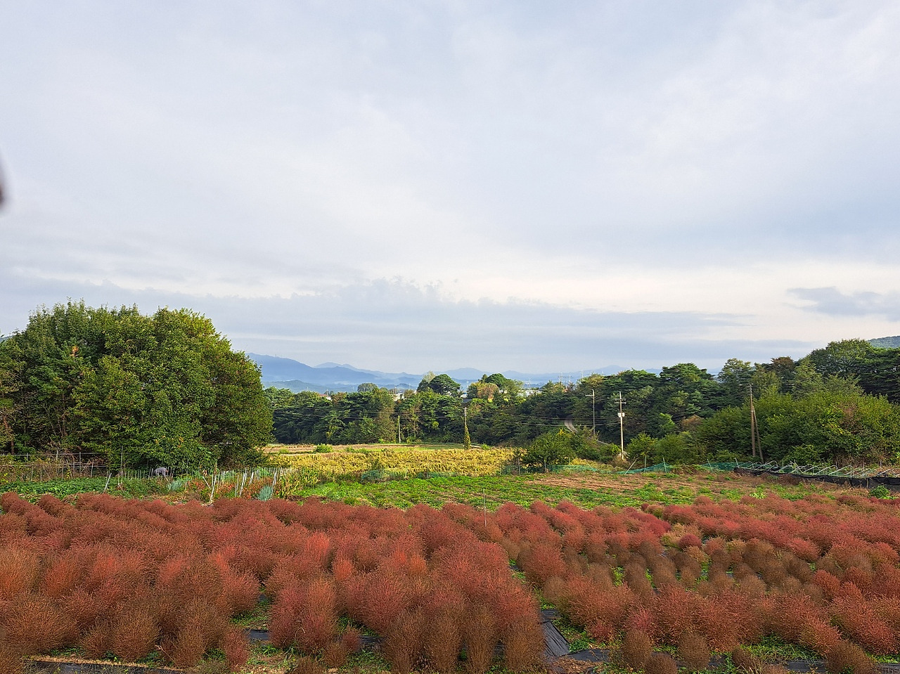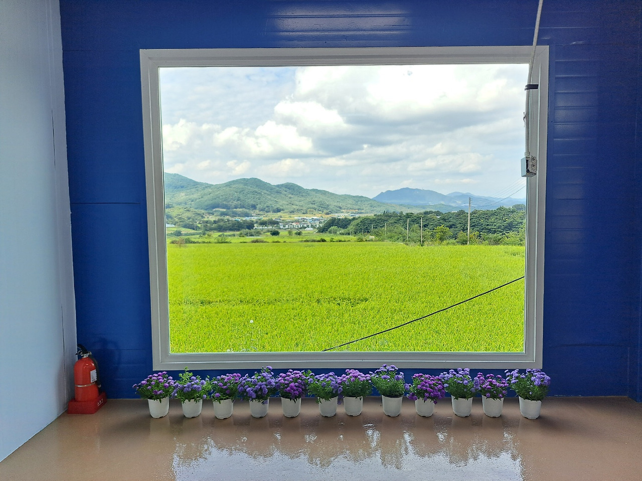 그리고 컨설팅 때 경관 조경의 보완 의견에 따라 댑싸리를 일부만 좀 해봤는데요. 파종을 하면서 제가 댑싸리를 속성을 100% 이해를 못 해가지고 관리가 잘 안 되었지만.. 이제 내년에는 그 앞 공간까지 더 좀 확장해서 멋진 경관이 만들어질 거예요. 그래서 디저트 간식을 만들어서 피크닉 바로 갈 수 있게요. 자유 시간에 거기에 보면 산책하기도 좋은 코스거든요. 그리고 체험장 있었잖아요. 두 군데를 통창을 내었더니 자연 풍경이 또 너무 좋아요.