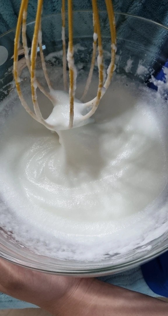 계란의 흰자만 분리해서 거품기로 실컷 저어준 다음 설탕을 넣고 또 열심히 저어야 하는데 내 역할은 계란 흰자만 분리해주는 일이다. 거품이 풍성하게 생길 때까지 만들어지면 옥수수 분말을 조금 넣은 뒤 또 열심히 저어야 한다. 계란 거품이 머랭처럼 끈끈해졌을 때주걱으로 떠서 팬 위에 모양을 잡아서 오븐에 구우면 된다.