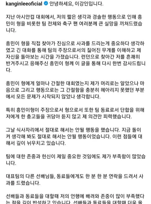 이 글을 읽으면서도 “이강인은 쓰레기, 걔는 혼 좀 나 봐야 돼”라는 생각을 버리지 못하는 사람이 있다면 그 사람은 자신이 스물두 살 때, 어떤 정신적 성숙의 상태였는지 가슴에 손을 얹고 잘 생각해 보길 바란다. 아마도 당신에겐 이런 사과글을 쓸 용기조차 없었을 것이라고 내 장담할 수 있다.