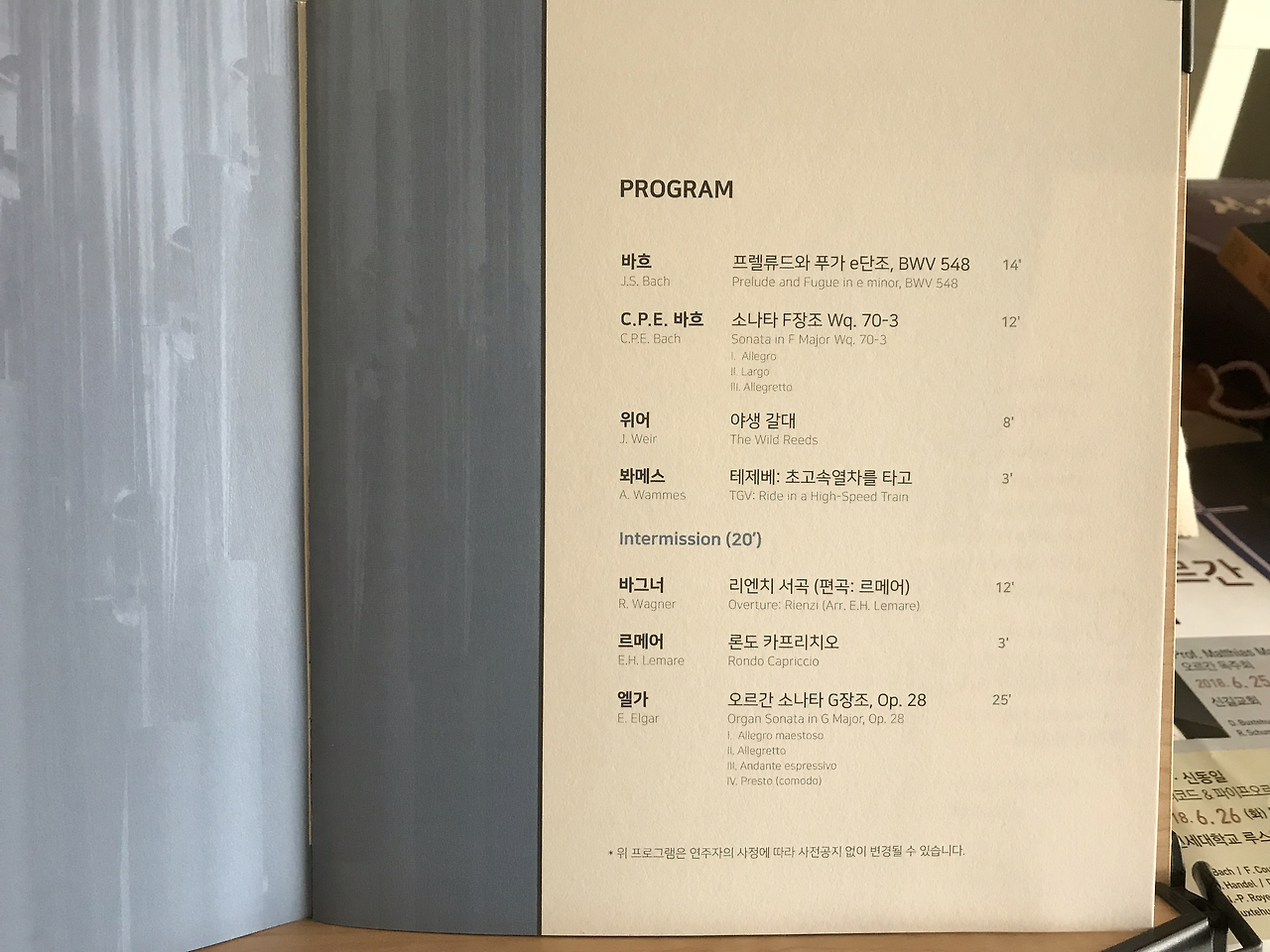 이번 연주회는 선입견을 가득 갖고 음악회에 간 것이 사실이다. ‘영국 오르가니스트라니..’ 크게 기대하지 않았고 혹시라도 운이 좋다면 화려한 테크닉의 재간둥이를 만나게 될 것이라는 교만한 마음으로 잠실로 향했다. ‘내가 한번 들어준다?’는 생각을 지닌 꼴불견 관객의 모습으로 음악회에 갔다가 아주 큰 코를 다치고 왔다. 이 분이 오르간을 대하는 모습은 앞서 다녀온 음악회의 독일 연주자들처럼 진지하고 엄숙한 모습은 아니었지만 진심으로 오르간을 사랑하고 그 앞에서 얼마나 많은 노력과 시간을 들였을 지 느낄 수 있었다. 나는 또다른 형태의 오르간 음악의 아름다움을 경험하고 나의 좁쌀만한 마음이 사정없이 두들겨 맞은듯 멍한 정신 상태로 집으로 돌아왔다.