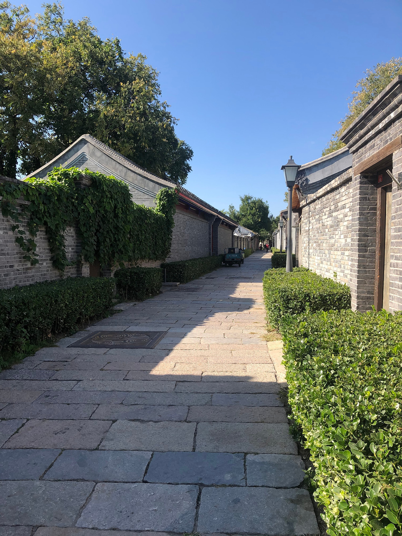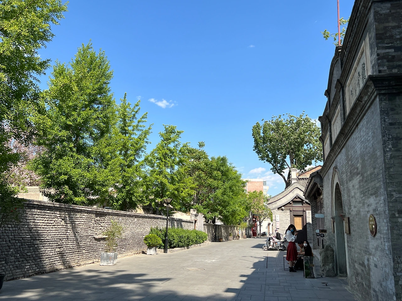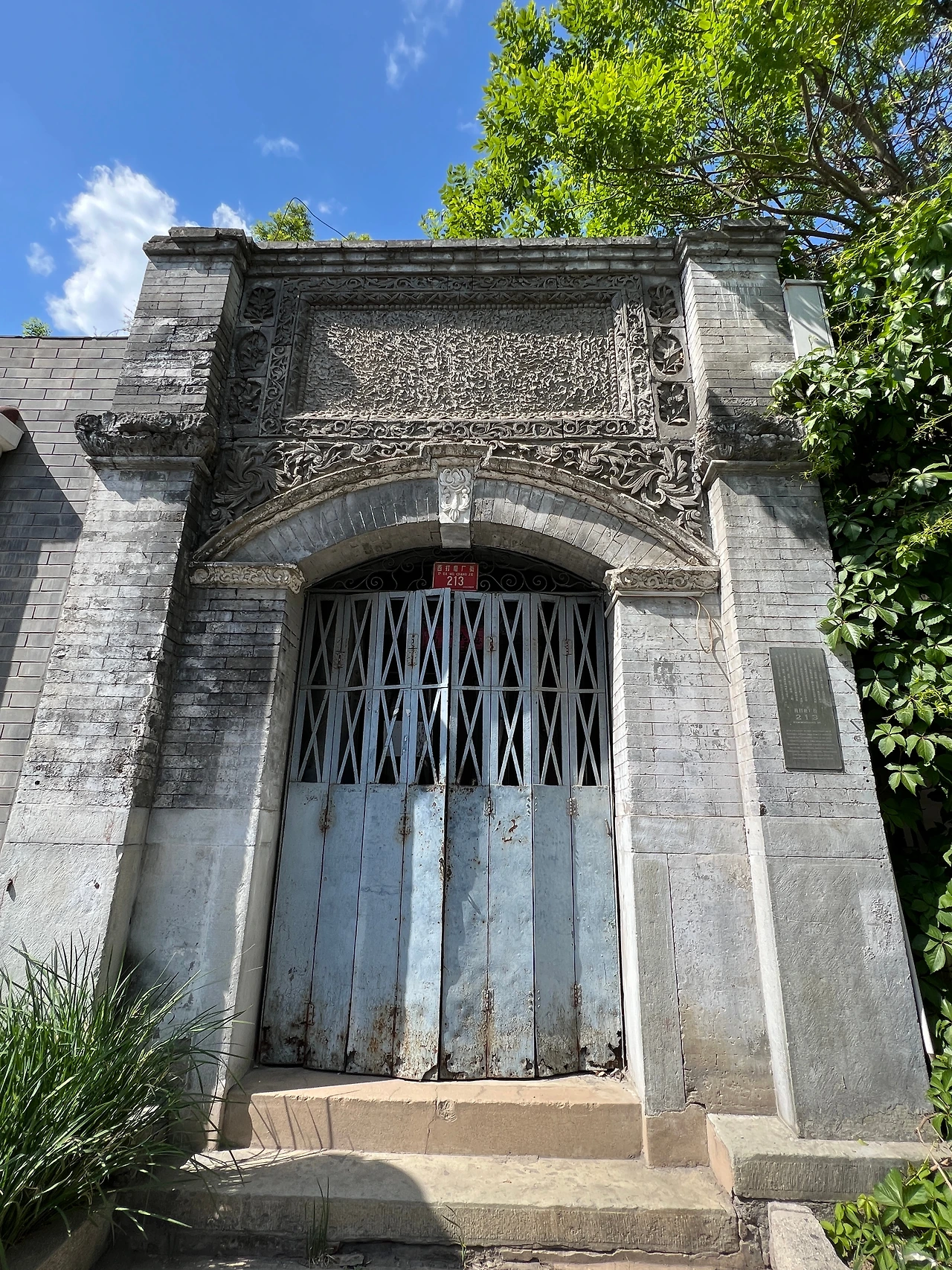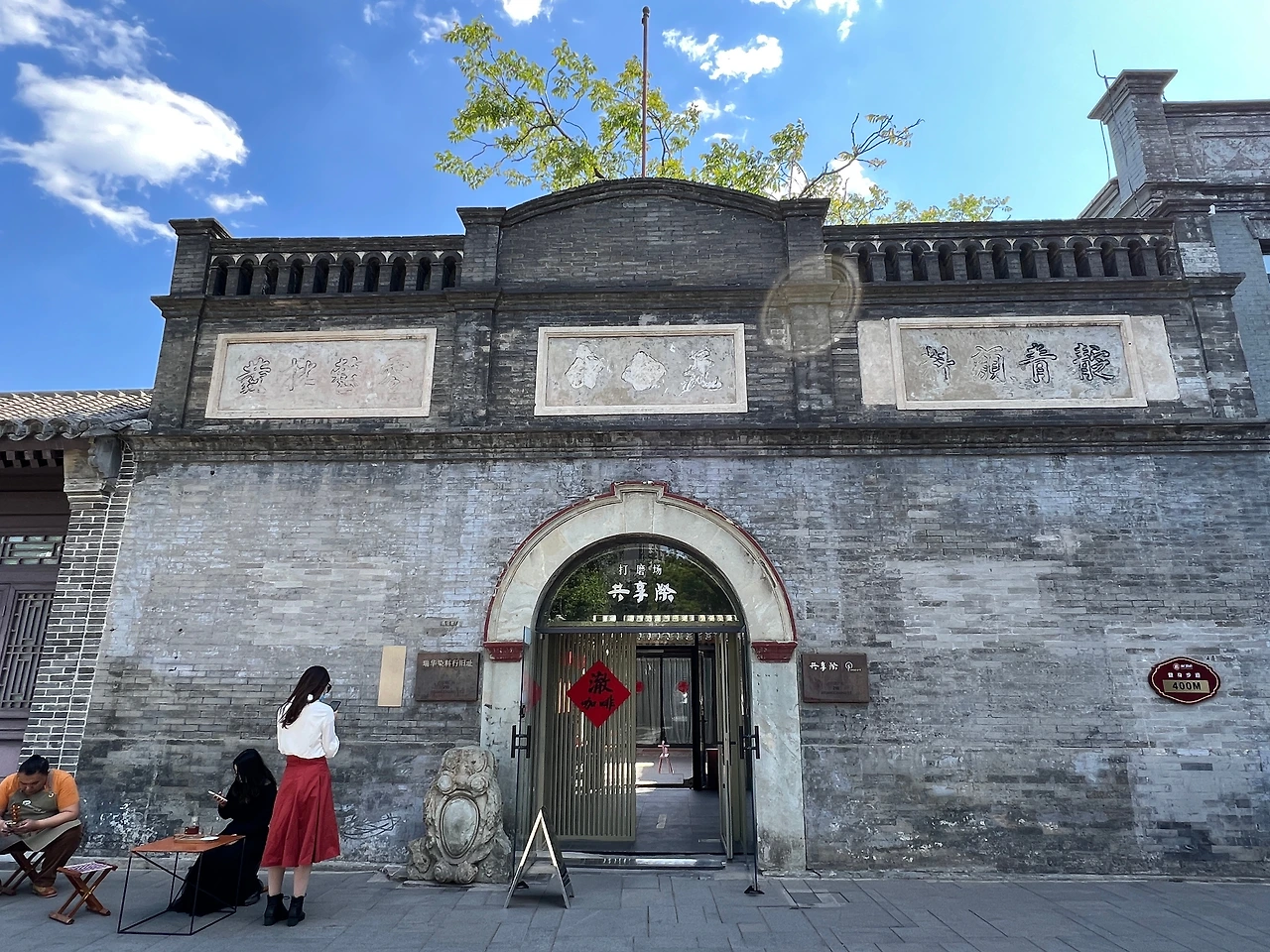 대문 입구의 아치형 틀은 보존이 비교적 완전하며, 문 입구 양측의 ‘靛青颜料(짙은남색염료)' '零整批发(소량도매)' 등 글자도 여전히 선명하다. 문 앞의 독특해 보이는 원형석각은 원래 이화원에 있던 것으로, 팔국연합군 침공시에 도둑질 당해 이곳으로 옮겨져 왔다고 한다. 오늘날 디자인, 가페, 꽃집, 민숙 등의 다양한 공간으로 사용 중이다.