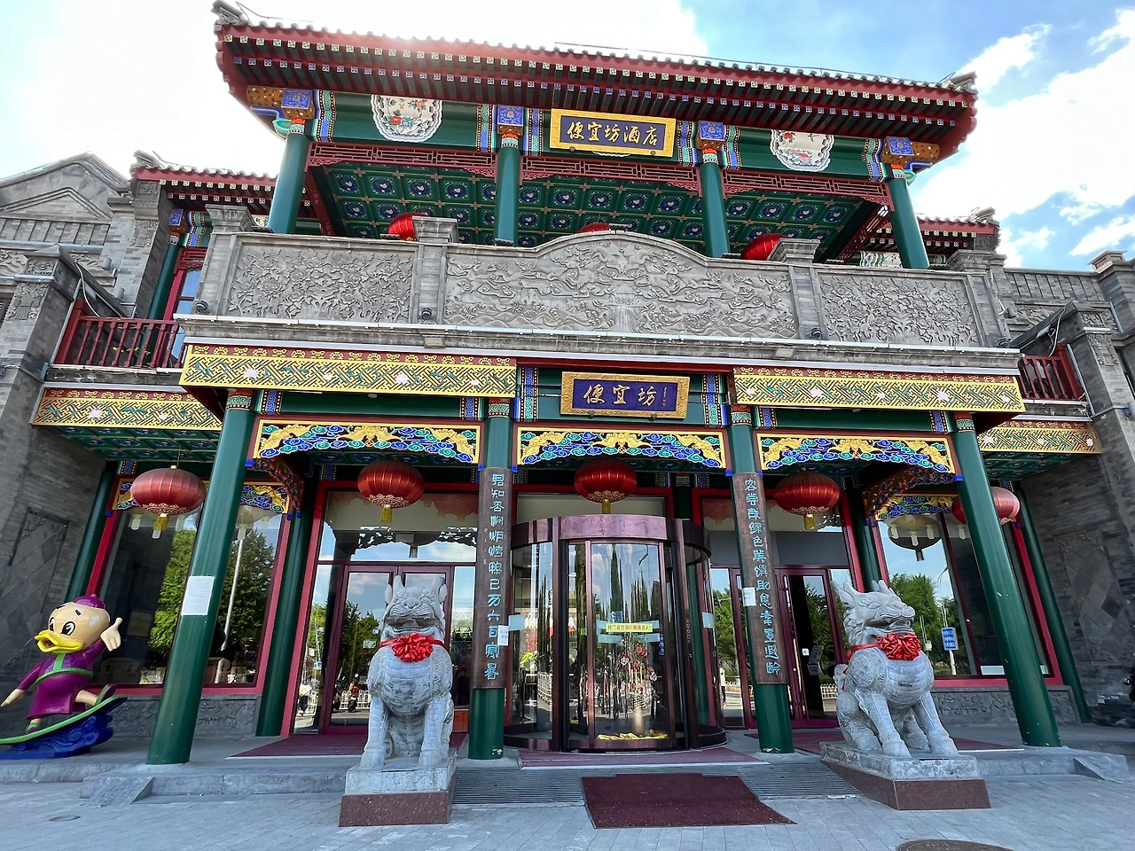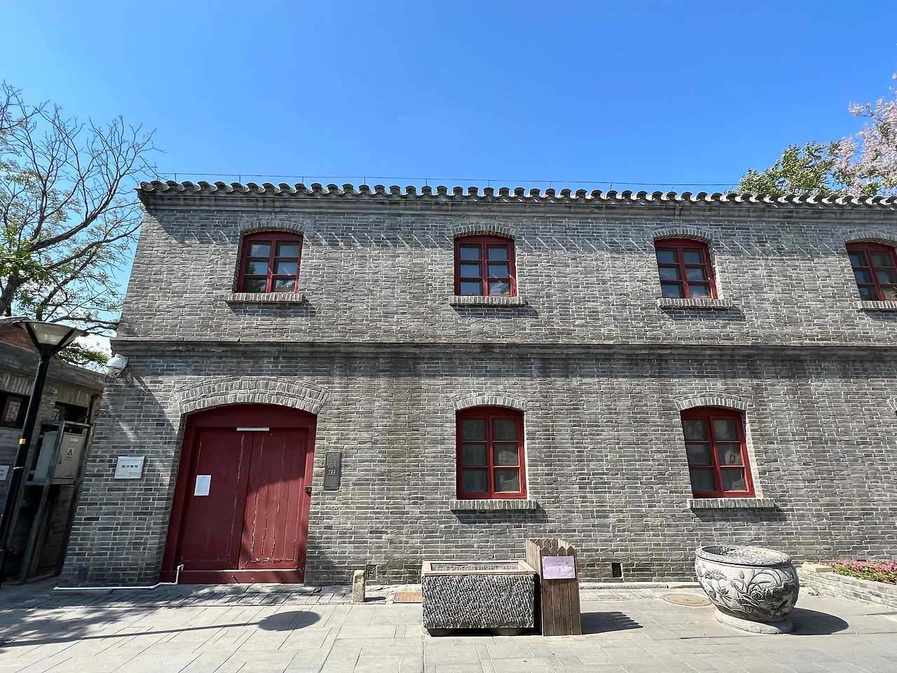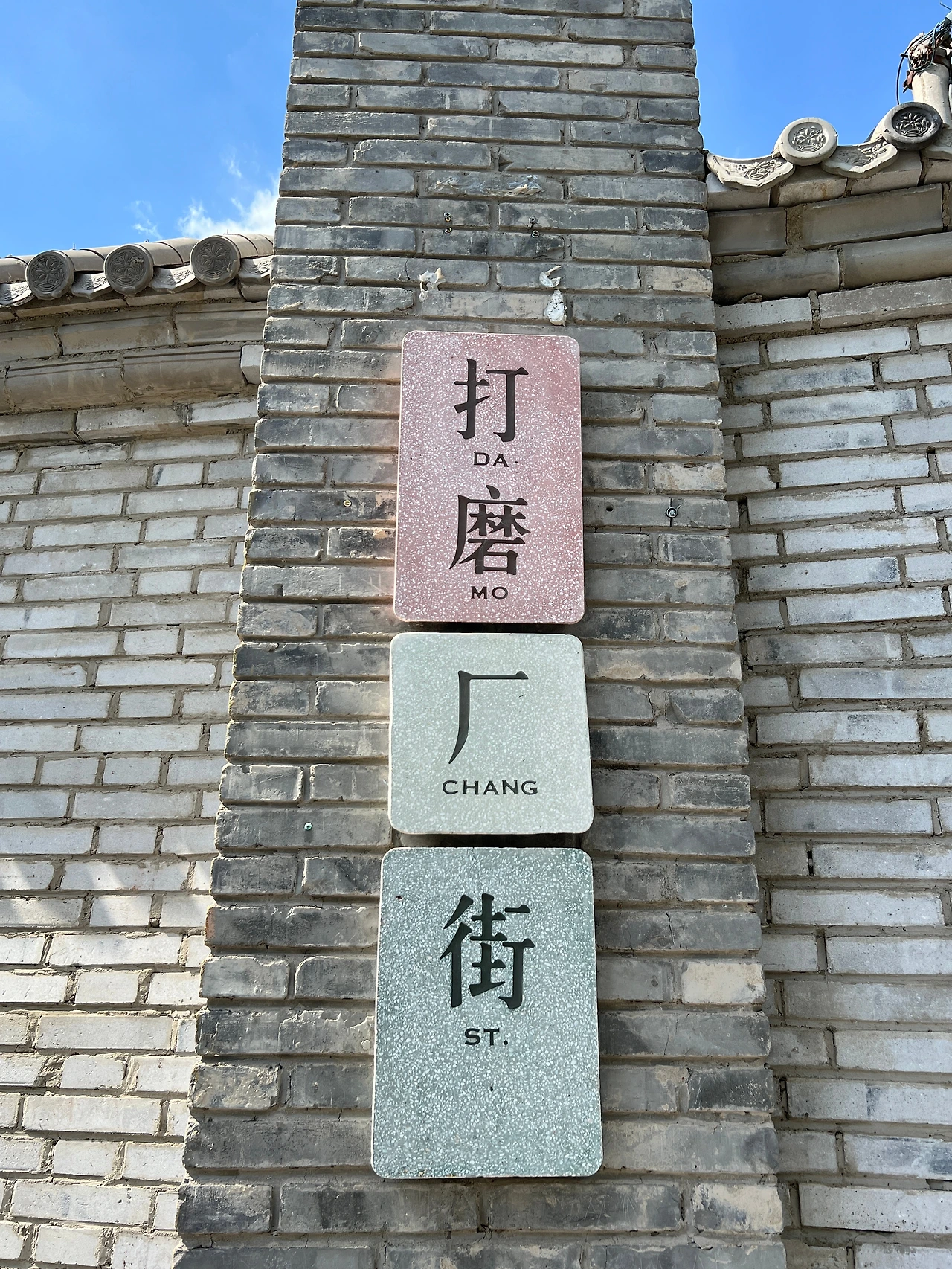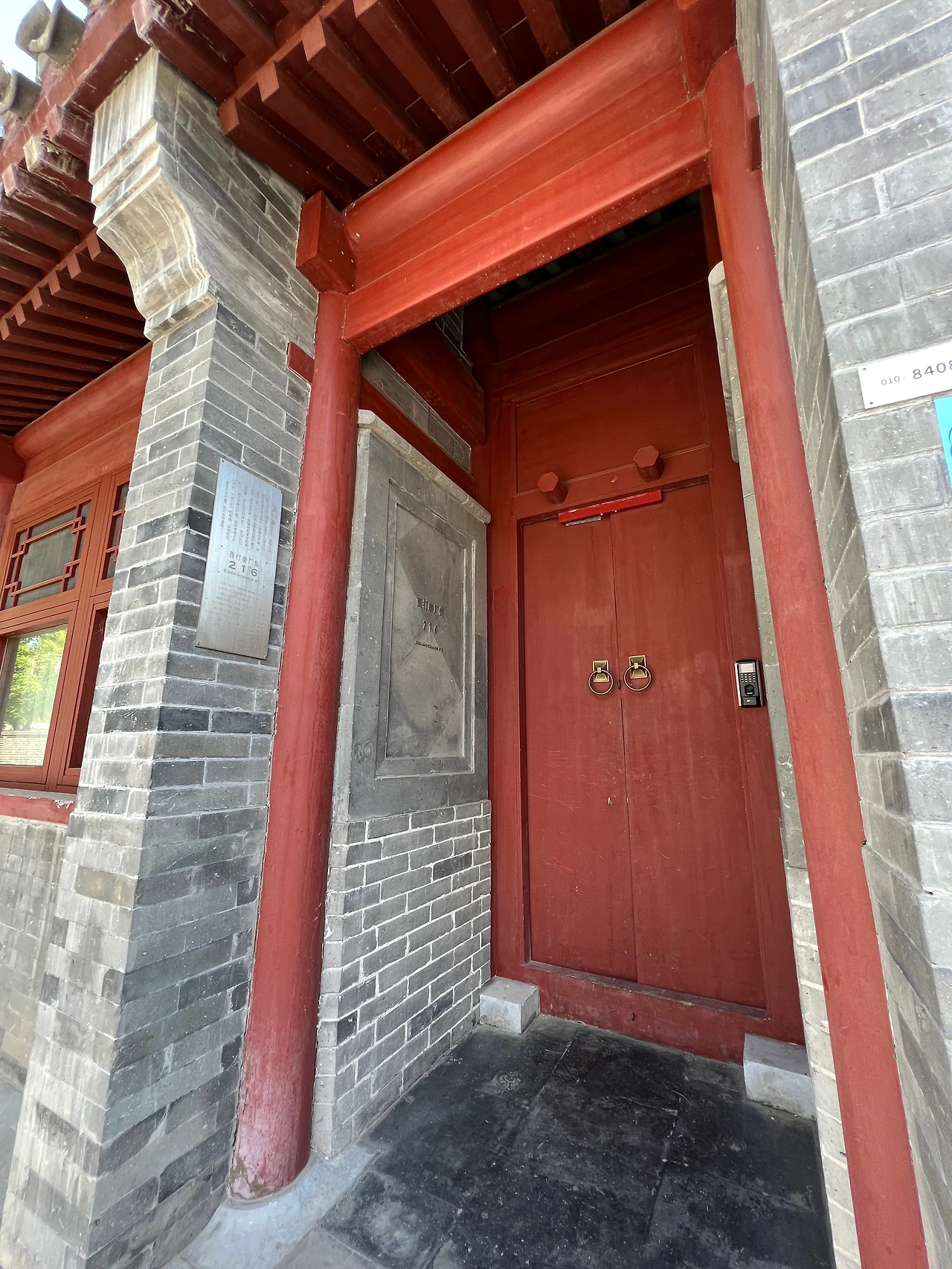 대문 입구의 아치형 틀은 보존이 비교적 완전하며, 문 입구 양측의 ‘靛青颜料(짙은남색염료)' '零整批发(소량도매)' 등 글자도 여전히 선명하다. 문 앞의 독특해 보이는 원형석각은 원래 이화원에 있던 것으로, 팔국연합군 침공시에 도둑질 당해 이곳으로 옮겨져 왔다고 한다. 오늘날 디자인, 가페, 꽃집, 민숙 등의 다양한 공간으로 사용 중이다.