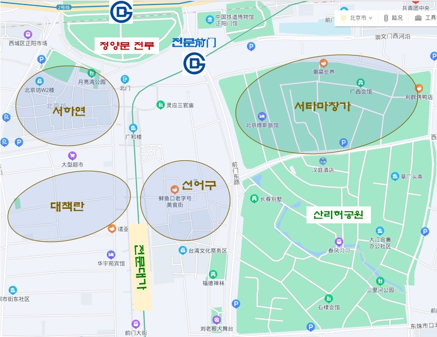 남북으로 길게 뻗은 전문대가 중심으로 서쪽에는 서하연(西河沿/시허얜)과 대책란(大栅栏/따자란)이, 동쪽에는 선어구(鲜鱼口/셴위커우)과 서타마창가(西打磨厂街/시따모창제)가 위치하였다.”
