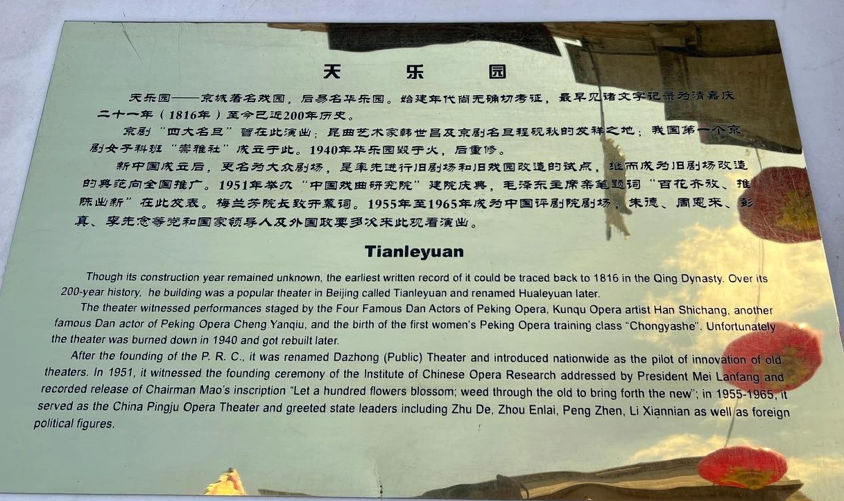 한 군데 더 발견했다. 천락원 극장 옛터 (天乐园/텐러웬) - 이 극장은 약 200년의 역사를 가진 북경의 옛 극장으로서, 경극의 4대 배우(四大名旦)가 모두 이곳에서 공연을 하여 유명해졌다. 경극 공연의 중요한 무대 중 하나로서, 경극 백 년 역사를 고스란히 간직하고 있는 곳이다. 2012년 8월 18일, 재건축되어 26년만에 재개방 되었다고 한다.