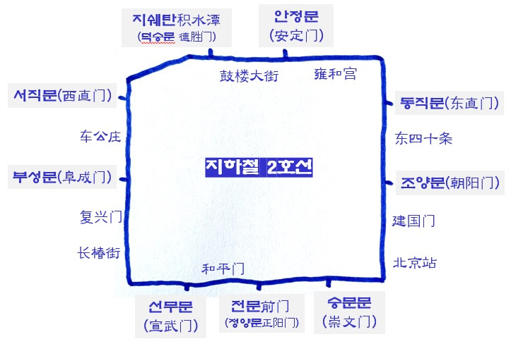 “내가 그의 이름을 불러 주었을 때 그는 나에게로 와서 꽃이 되었다”와 같이, 이름은 단순히 명사(名詞)가 아니라 의미와 역사를 지닌다. 왼쪽 지도의 내성 성문 이름들이, 오른쪽 지하철 2호선 역이름으로 고스란히 ‘안착’ 되어있다. 비록 지금 성문은 남아있지 않지만, 과거 각각의 성문이 담당하던 역할과 의미가 현재까지도 주변 관광지와 옛 골목(후통)에 남긴 흔적들이 존재하며 그것들을 찾는 것. 그리고 그 흔적들과 현재의 흥미로운 볼거리를 연결시키는 것이 나에게는 북경 살이의 즐거움 중 하나이다.