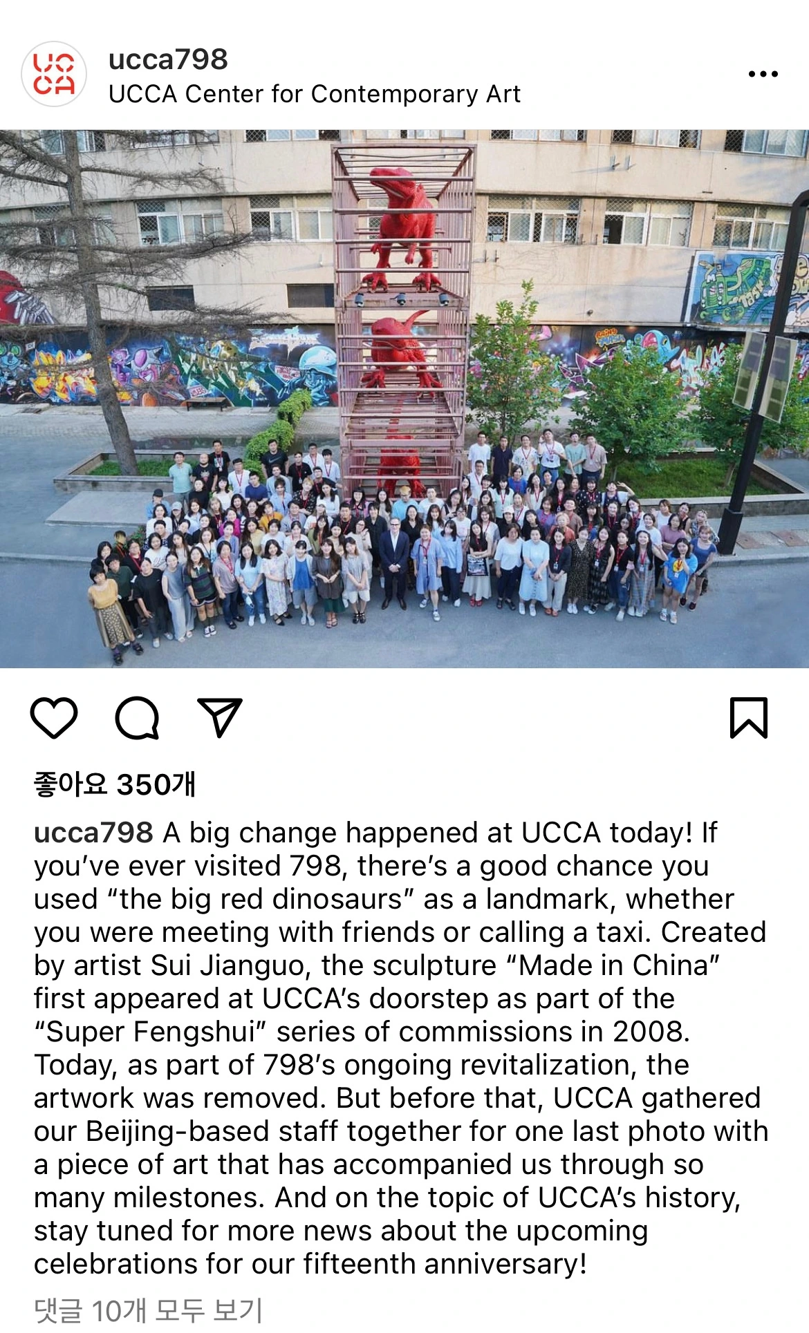 798예술구를 오랫동안 지켜온 상징적인 조형물이 있다. UCCA 앞, 거대한 붉은 공룡들이 3층 철장에 갇힌 조형물이 그것인데, 바로 2008년에 설치된 수이젠궈(隋建国) 작가의 'Made in China'라는 작품이다. 거대하기도 하고 특이하기도 하여 오랫동안 798과 UCCA의 랜드마크였는데 올 여름 철거되었다고 한다. 나도 오랜만에 UCCA를 방문하여 보니 사라져서 아쉬움이 컸다. 친구와 만나거나 택시 부를 때 상징적이었던 랜드마크… 향후 어떤 새로운 작품이 이 지위를 대신할지, 아쉬움을 기대감으로 대체해본다.