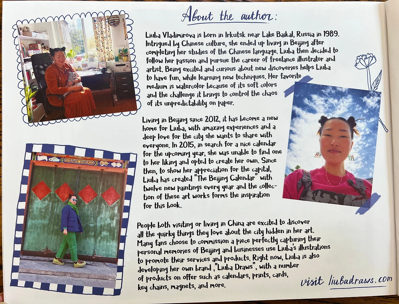 2012년부터 베이징에 거주하면서 이곳은 리우바에게 새로운 고향이 되었습니다. 베이징이라는 도시에 대한 놀라운 경험과 애정을 모든 사람들과 나누고 싶어졌습니다. 2015년, 그녀는 새해에 사용할 달력을 찾던 중에 마음에 드는 것이 없어서, 결국 자신이 만들어보기로 합니다. 그때부터 지금까지, 리우바는 베이징에 대한 애정과 감사를 모아 매년 새로운 그림 12점을 담은 ‘베이징 달력’을 만들어오고 있습니다. 달력 그림들이 차곡차곡 모아지면서 마침내 책 출간에 영감을 주게 되었습니다.