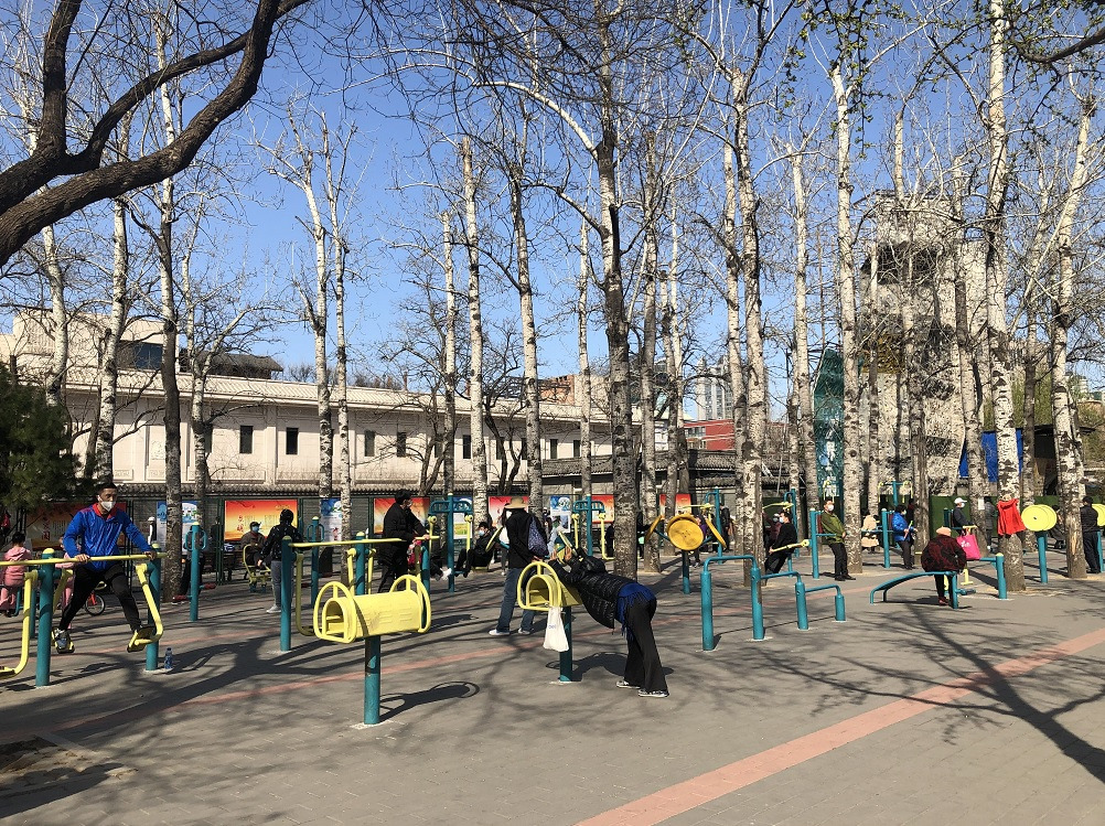 베이징의 거주 단지들은 대부분 야외 공용 체육시설을 포함하고 있어서 노년층들이 활동적이고 건강한 삶을 유지하고 운동하는 것을 좋아합니다. 더불어 산책, 휴식, 게임 등도 즐기며 최근 소문들을 주고받기도 합니다.
