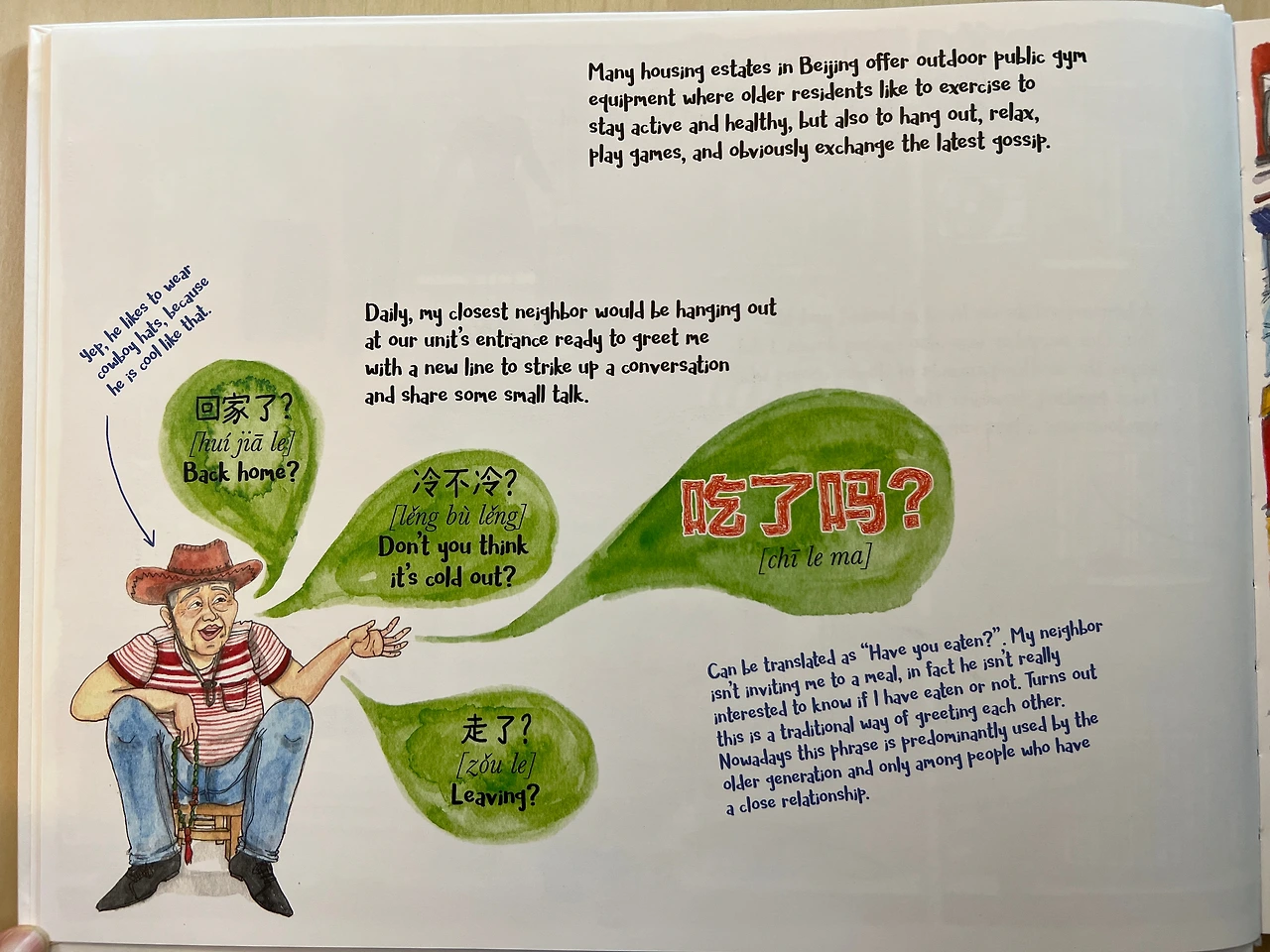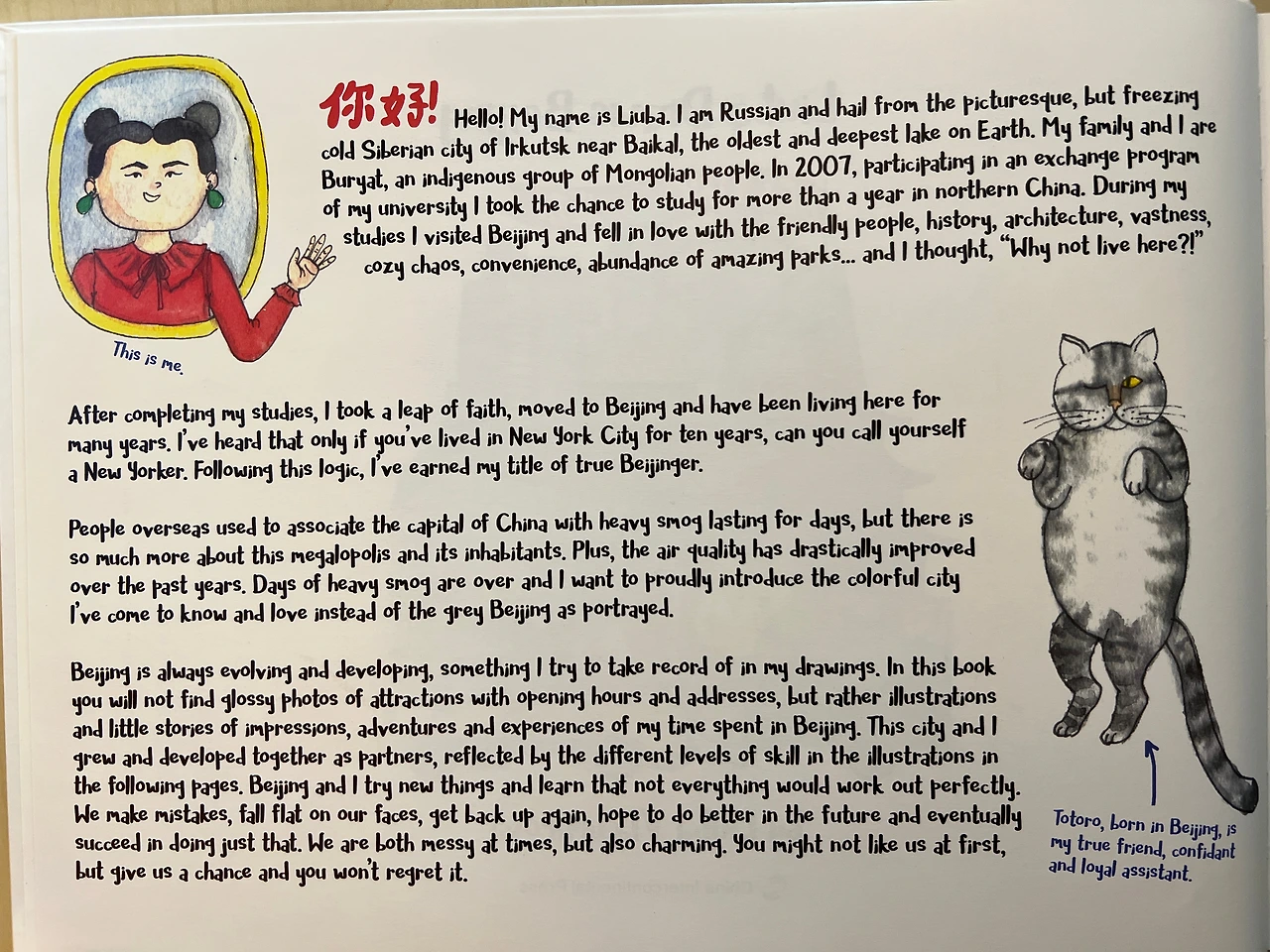 베이징은 계속 진화하고 발전 중이며, 내 그림 속에 기록해놓으려고 노력합니다. 이 책에서는 광택나는 멋들어진 사진들과 상점 운영시간이나 주소 등은 없습니다. 내가 베이징에서 지내온 시간들의 경험, 모험, 감동의 작은 이야기들과 삽화들이 담겨져있을 뿐입니다. 이 도시와 나는 파트너로서 함께 성장해왔습니다. 책의 각 페이지마다 그림 실력이 다른 것이 그 증거입니다. 베이징과 나는 새로움을 추구하며 모든 것이 완벽할 수는 없음을 배웠습니다. 우리는 실수와 실패를 경험하기도 하며 다시 일어나 미래에는 더 잘할 거라는 희망도 가져보며, 우연히 성공하기도 합니다. 우리는 때때로 엉망이 되지만 동시에 매력도 넘칩니다. 어쩌면 처음에는 우리를 좋아하지 않을 수도 있습니다만, 우리에게 기회를 준다면 절대 후회하지 않을 것입니다.