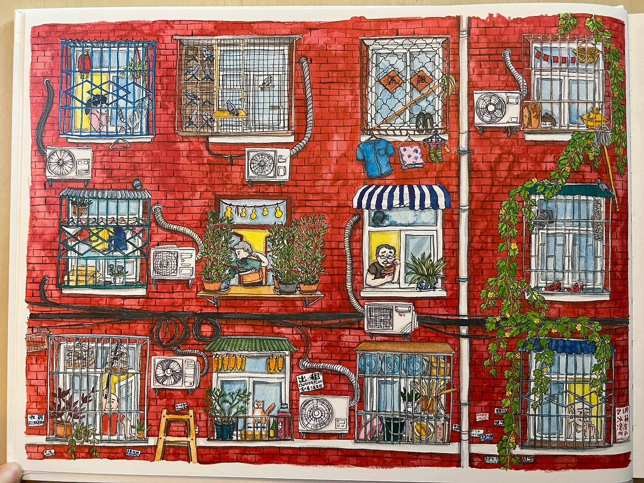 우리가 살았던 아파트 단지는 이 그림과 비슷합니다. 이웃들은 비둘기를 키웠습니다. 나는비둘기가 구구거거리며 위로하는 듯한 소리를 들으며 그림 그리는 것을 즐겼습니다. 하지만 우리집 창문에 떨어진 비둘기똥은 그리 낭만적인 일은 아니었습니다.