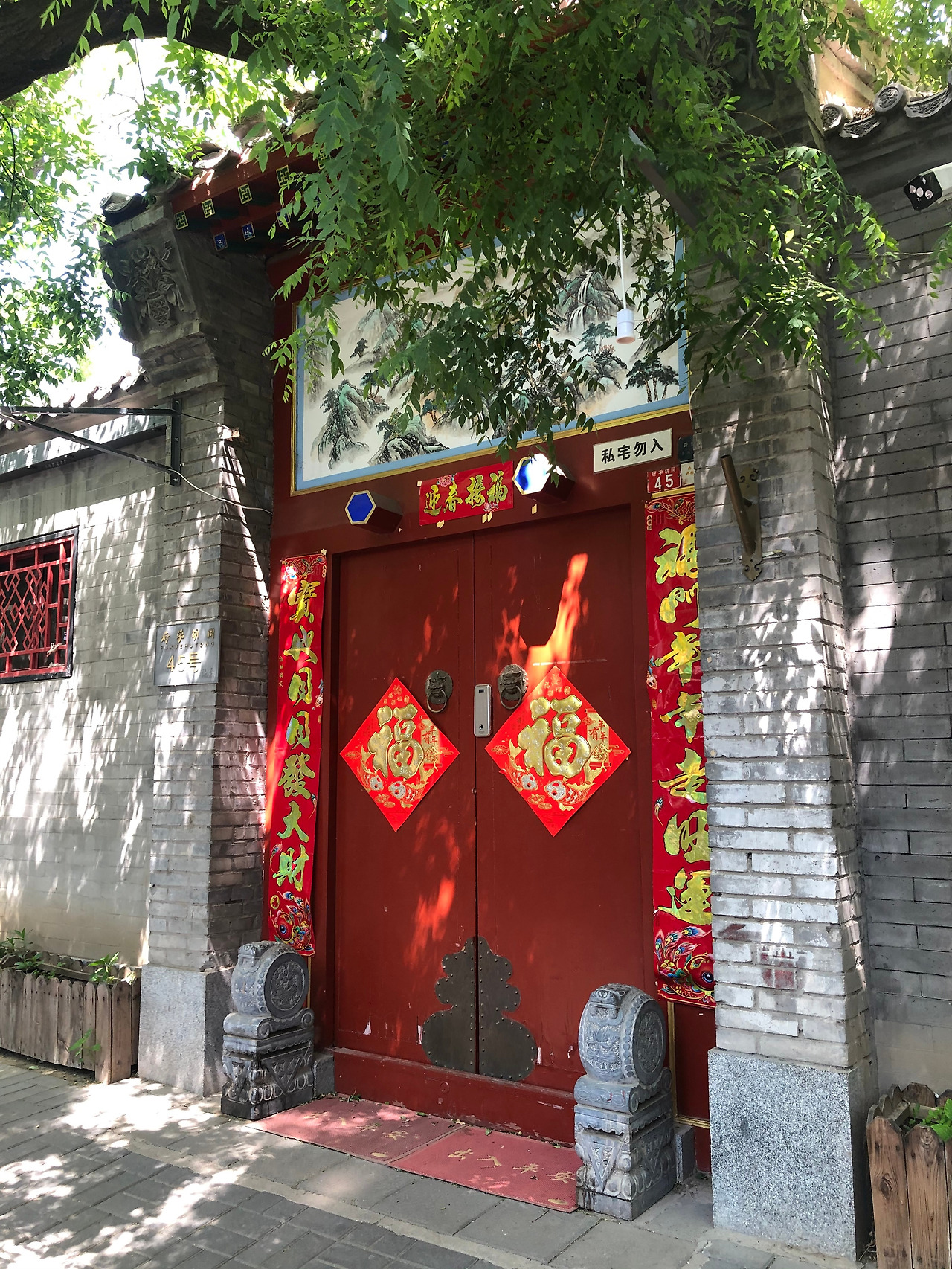 Red stickers on the door with the character 福 [fú] - meaning ‘good fortune” turned upside down. It’s a form of word play “ 倒 [dào] means ‘upside down’ which sounds the same as 到 [dào] – ‘Arrived’. Together this makes 福到 [fú dào] – ‘good fortune arrived’.
