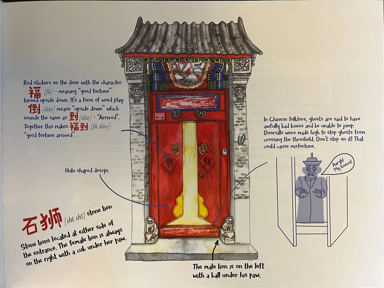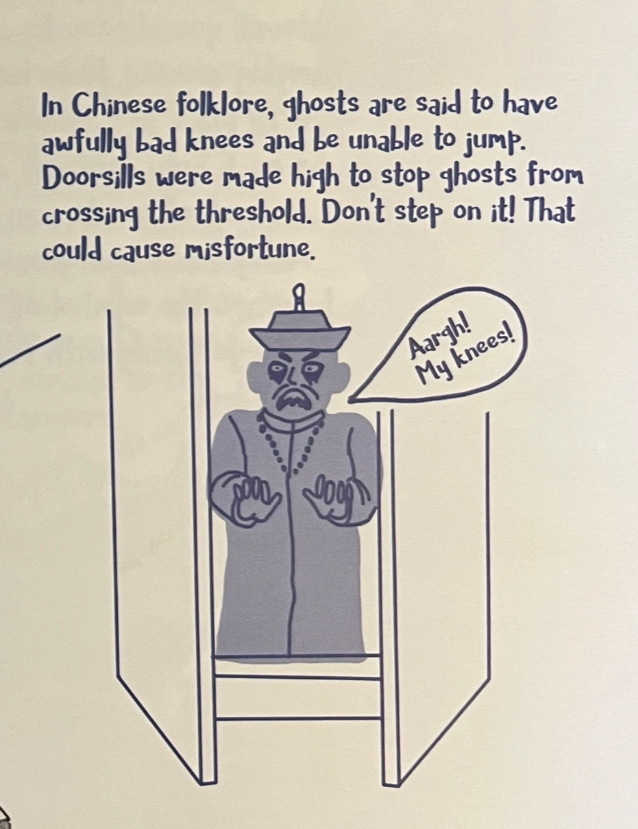 In Chinese folklore, ghosts are said to have awfully bad knees and be unable to jump. Doorsills were made high to stop ghosts from crossing the threshold. Don’t step on it! That could cause misfortune.