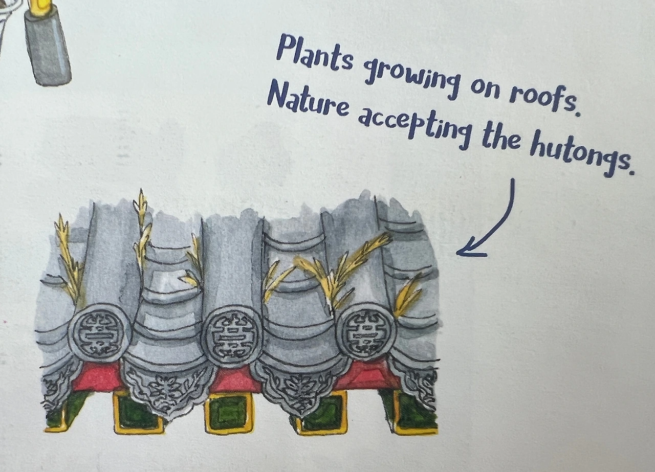 The narrow hutong in Beijing is only 40cm wide. / Plants growing on roofs. Nature accepting the hutong.