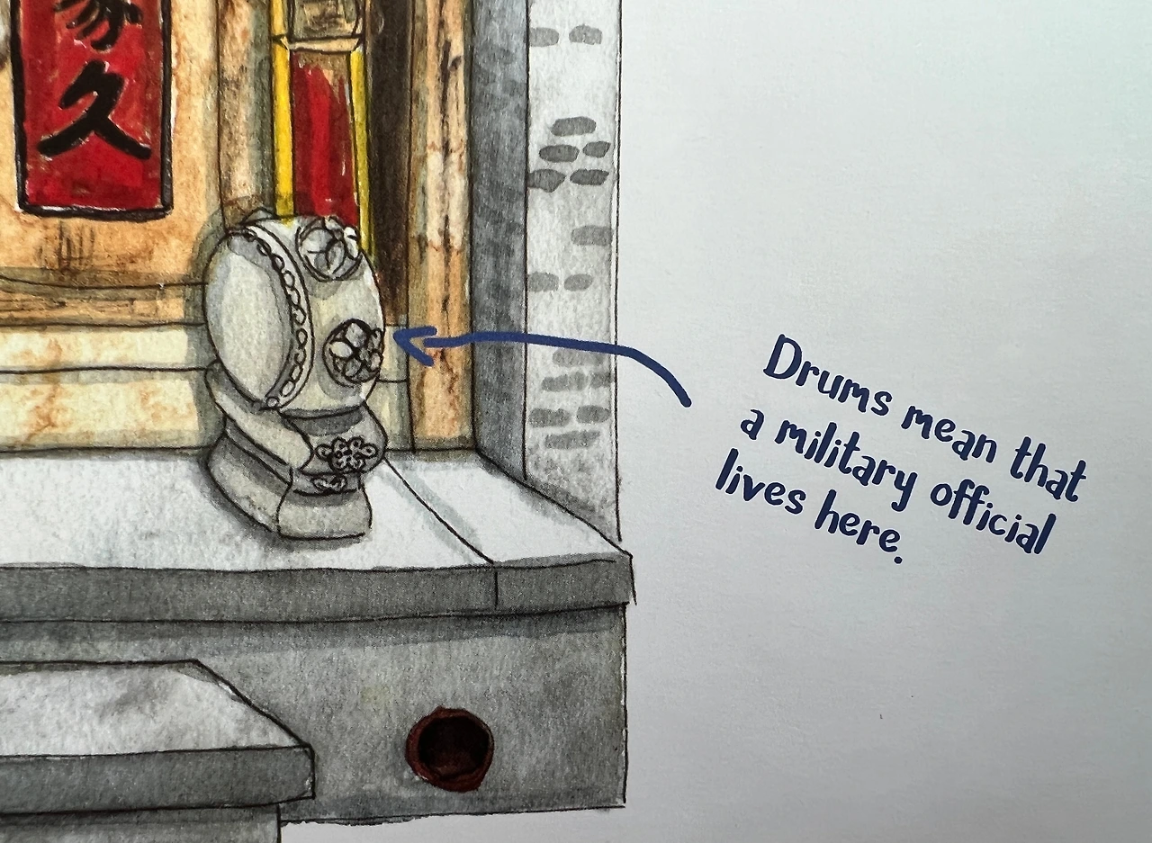 * 문돈 (門墩) : 대문 앞 계단에 놓여진 장식물로서 사자는 황족, 책 모양은 문신, 북 모양은 무신이 거주함을 의미했다.