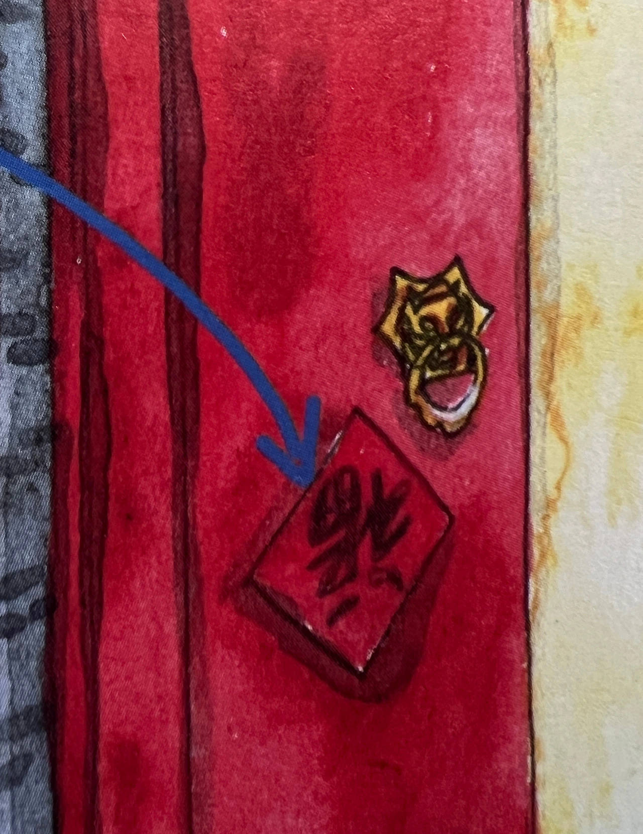 복/福(푸)이라는 한자가 문 위 붉은 종이에 거꾸로 씌여져 붙어있습니다. 이는 언어유희의 일종인데, 倒(다오)는 뒤집어지다라는 뜻을 가지고 있고, 도착하다는 의미의 到(다오)와 동음이의어입니다. 두 글자가 합쳐진 福到(푸다오)는 ‘복이 도착하다’라는 의미가 됩니다.