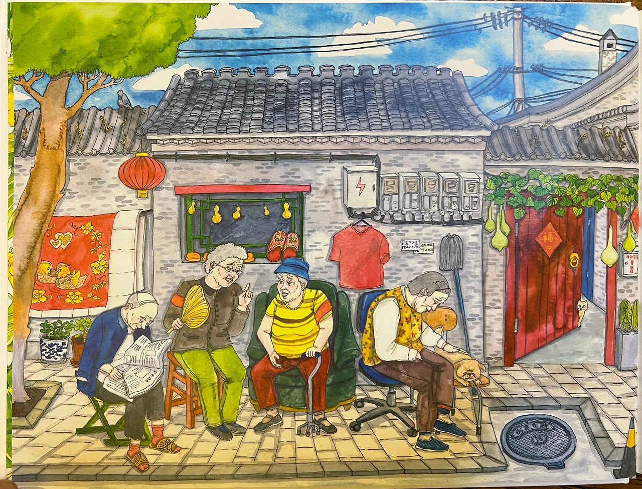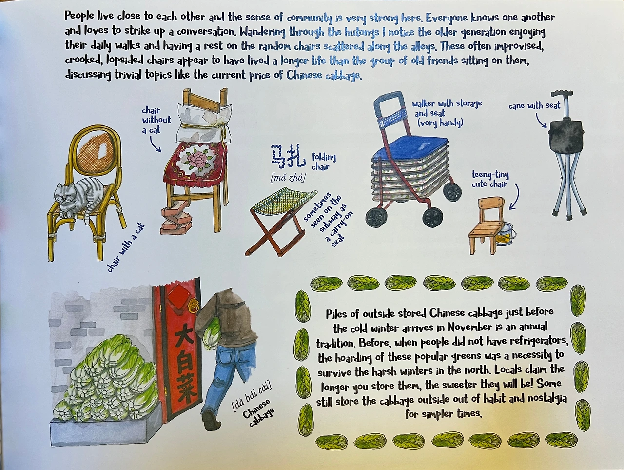 이곳 후통에서 사람들은 서로 가까이에 살며 공동체 의식이 매우 강합니다. 모든 사람들이 서로를 잘 알며 대화하는 것을 좋아합니다. 후통을 어슬렁거리다보면, 나는 노인들이 산책을 즐기며 골목 따라 아무렇게나 놓여진 의자에서 휴식을 즐기는 모습을 봅니다. 즉흥적이고 비뚤어지고 한쪽이 기울어진 의자들은 거기에 앉아서 지금 배추 가격이 얼마인지 등의 소소한 이야기를 나누고 있는 오래된 친구들보다 더 긴 삶을 살아온 것 같습니다.