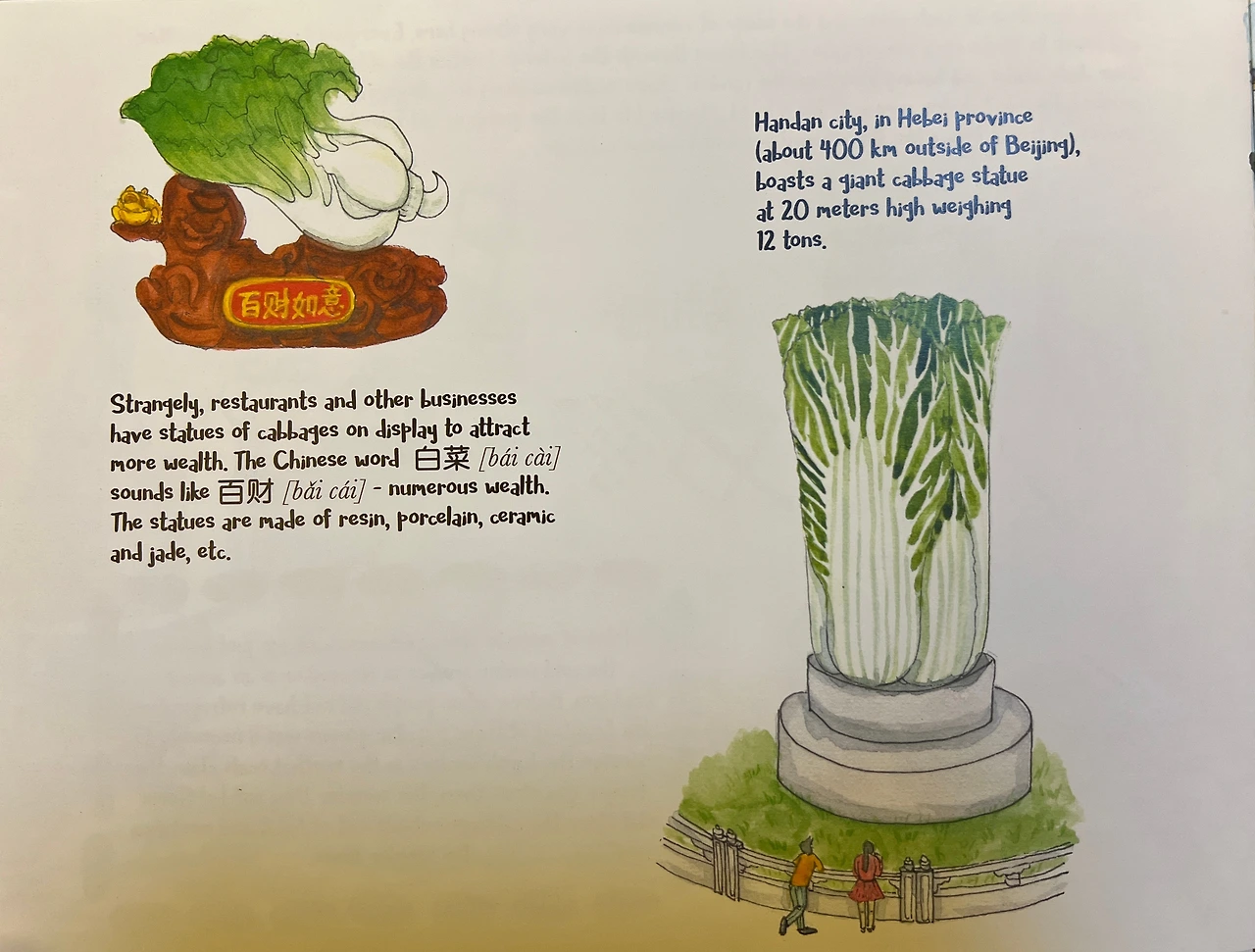 이상하게도 식당이나 회사들은 더 많은 부를 갈망하며 배추 동상을 세워놓습니다. 중국어로 배추(白菜)는 “바이차이”로 발음하는데, 이는 많은 부를 의미하는 百财 단어와 발음이 같습니다. 배추 동상은 수지, 도자기, 옥 등으로 만들어졌습니다.