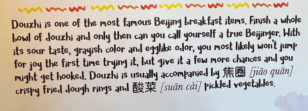 fermented mung bean milk. Douzhi is one of the most famous Beijing breakfast items. Finish a whole bowl of douzhi and only then can you call yourself a true Beijinger. With its sour taste, grayish color and egglike odor, you most likely won't jump for joy the first time trying it, but give it a few more chances and you might get hooked. Douzhi is usually accompanied by 焦圈 [jião quãn] crispy fried dough rings and 酸菜 [suān cai] pickled vegetables.