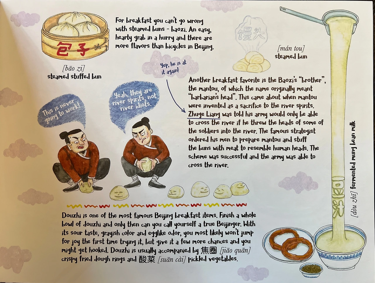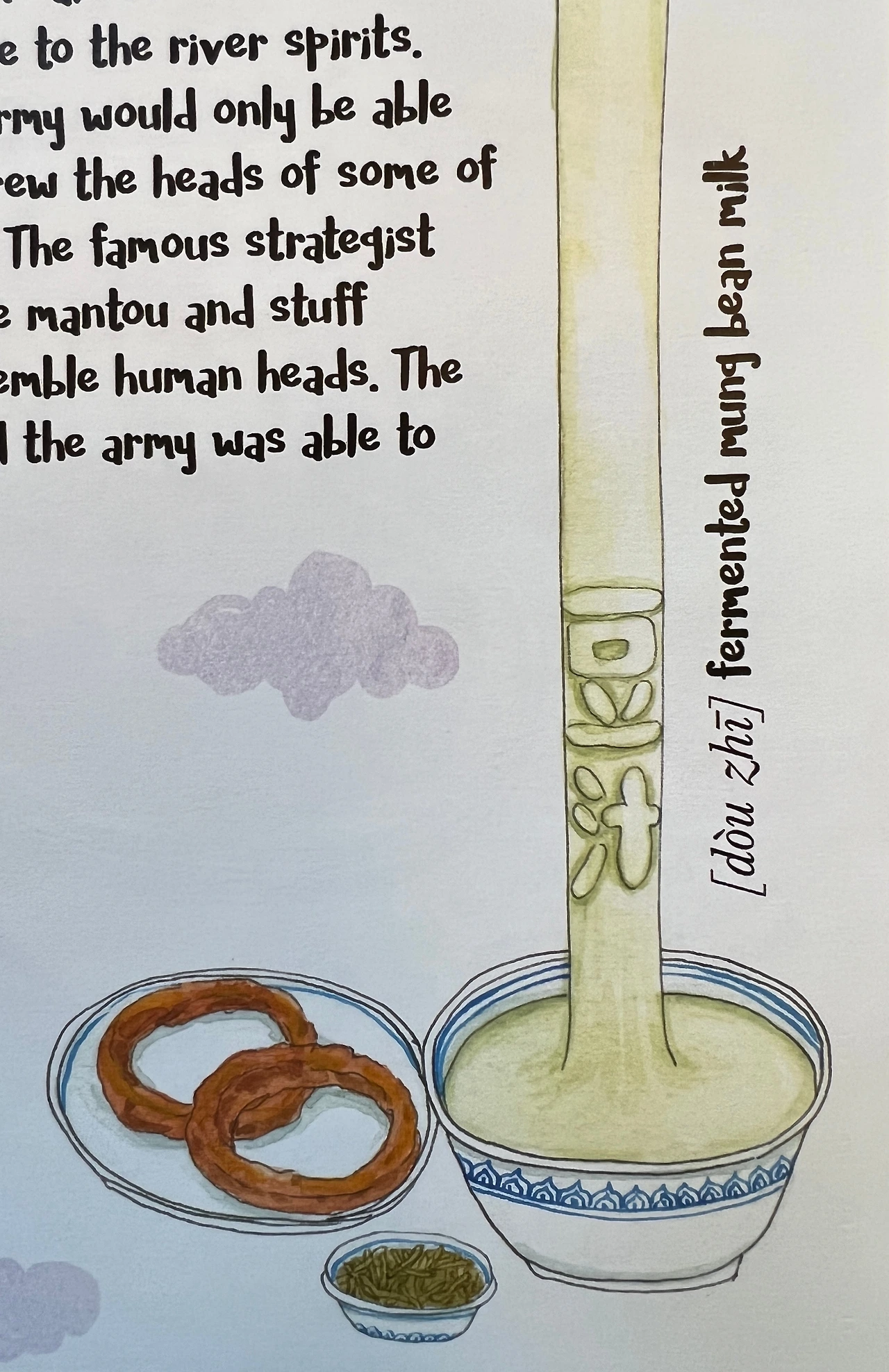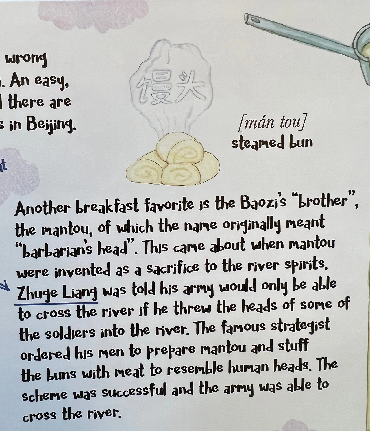 steamed bun. Another breakfast favorite is the Baozi's "brother", the mantou, of which the name originally meant "barbarian's head". This came about when mantou were invented as a sacrifice to the river spirits. Zhuge Liang was told his army would only be able to cross the river if he threw the heads of some of the soldiers into the river. The famous strategist ordered his men to prepare mantou and stuff the buns with meat to resemble human heads. The scheme was successful and the army was able to cross the river.