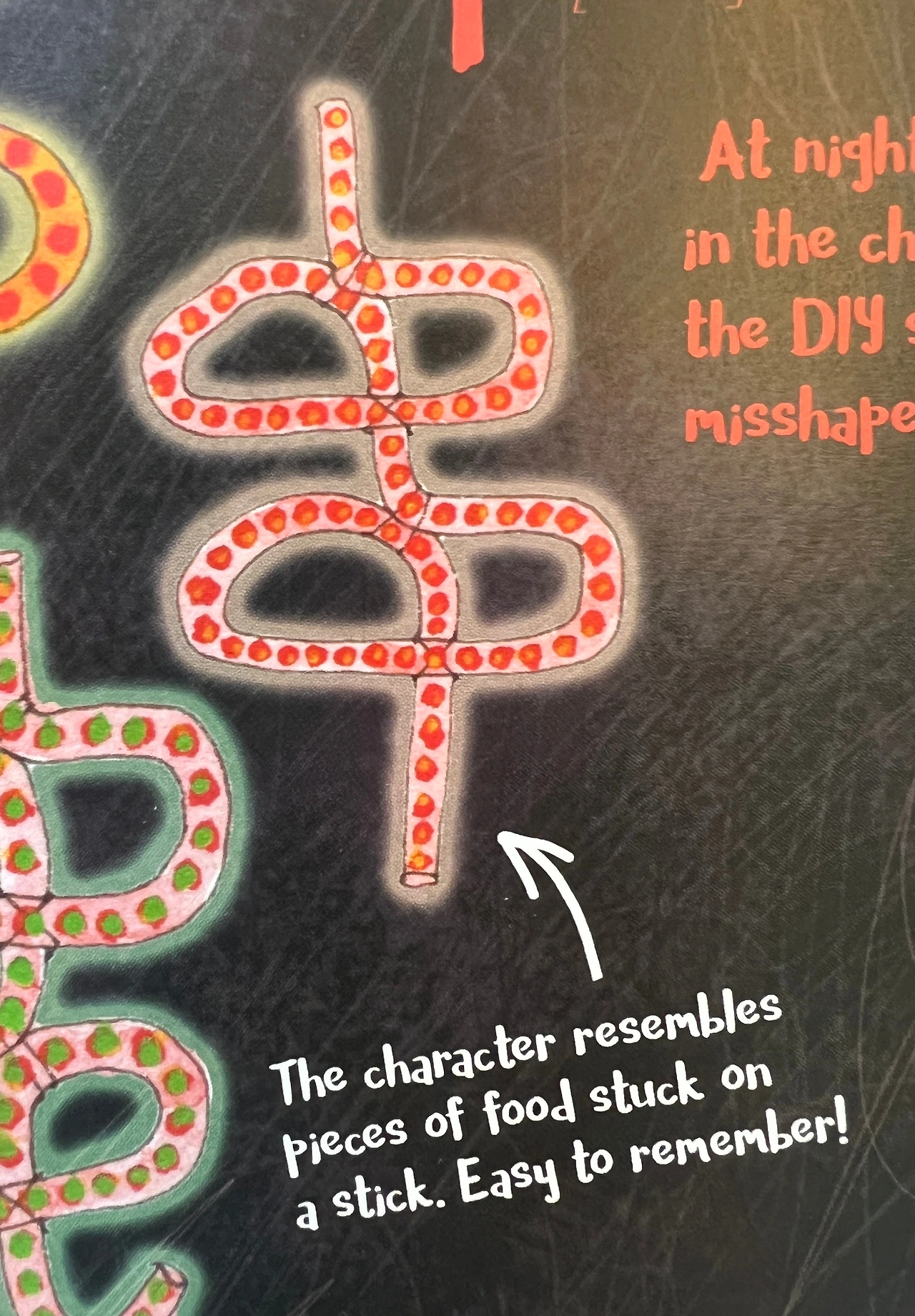 The character resembles pieces of food stuck on a stick. Easy to remember!