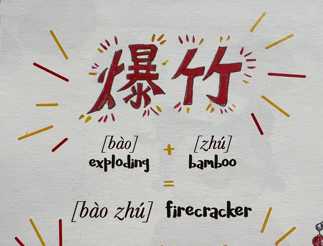 爆竹 [bào zhú] exploring + bamboo = firecracker