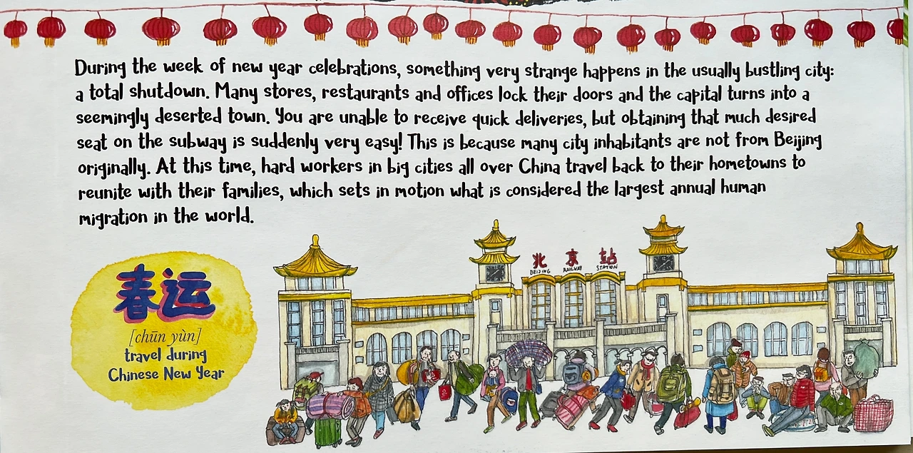 During the week of new year celebrations, something very strange happens in the usually bustling city: a total shutdown. Many stores, restaurants and offices lock their doors and the capital turns into a seemingly deserted town. you are unable to receive quick deliveries, but obtaining that much desired seat on the subway is suddenly very easy! This is because many city inhabitants are not from Beijing originally. At this time, hard workers in big cities all over China travel back to their hometowns to reunite with their families, which sets in motion what is considered the largest annual human migration in the world.
